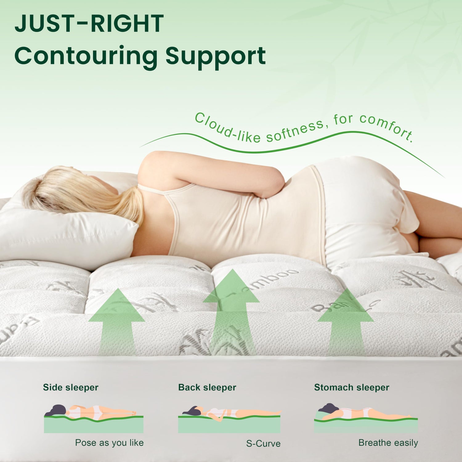 • Cool & Breathable: Our mattress topper uses 40% rayon derived from bamboo (more breathable) 60% polyester (softer) fabric. The microfiber filling (3D and 7D) provides softness and extra resilience. The composition is designed to prevent you from feeling stuffy and sweaty, allowing for more efficient airflow to reduce overheating, therefore allowing you to enjoy a refreshing experience