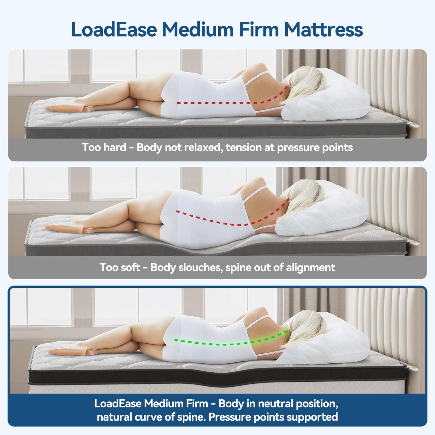 - Comfortable Support for Restful Sleep - The LoadEase 60" W x 80" D x 14" queen mattress size 14 inch combines memory foam, multi-layer foam, and an independent spring support system. This blend ensures even weight distribution from head to toe, providing targeted support that allows your muscles to fully relax for a restful night’s sleep