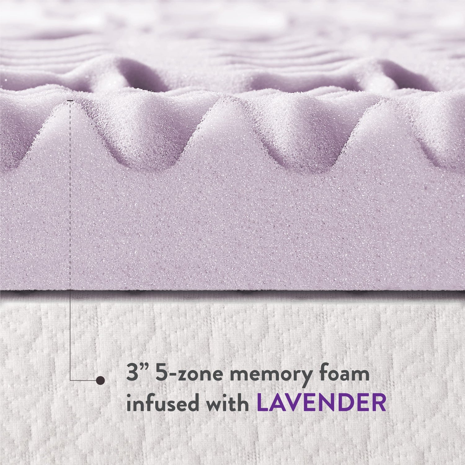 Mellow 3 Inch 5-Zone Memory Foam Mattress Topper, Soothing Lavender Infusion, Dorm Essentials, Queen