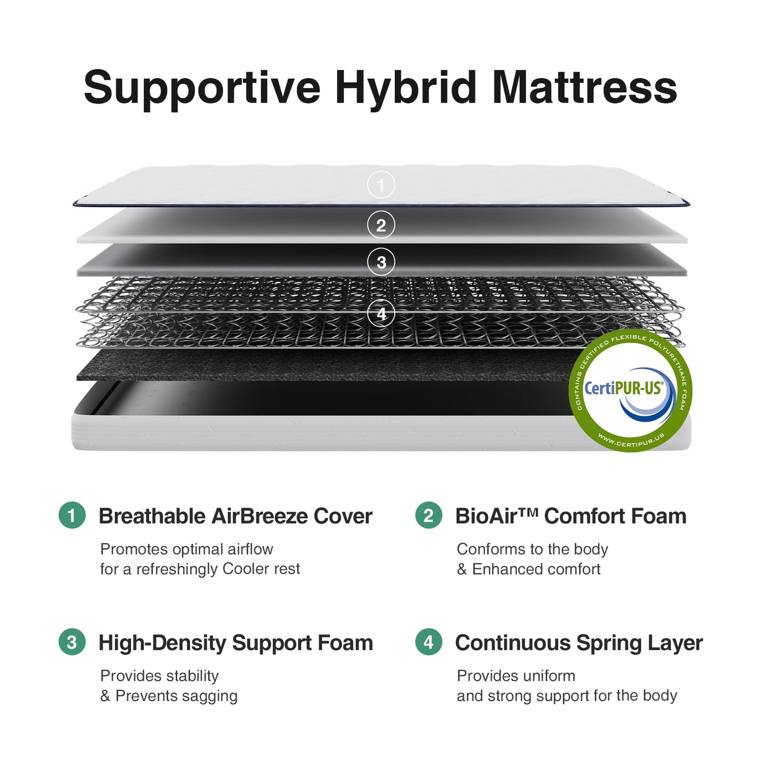 - 【Enhanced Support with Bonnell Springs】The Bonnell Springs in this hybrid full mattress provide firm, even support across the entire sleep surface, promoting proper spinal alignment and reducing back pain. The hourglass-shaped coils distribute weight evenly, ensuring a comfortable and supportive experience for all body types.