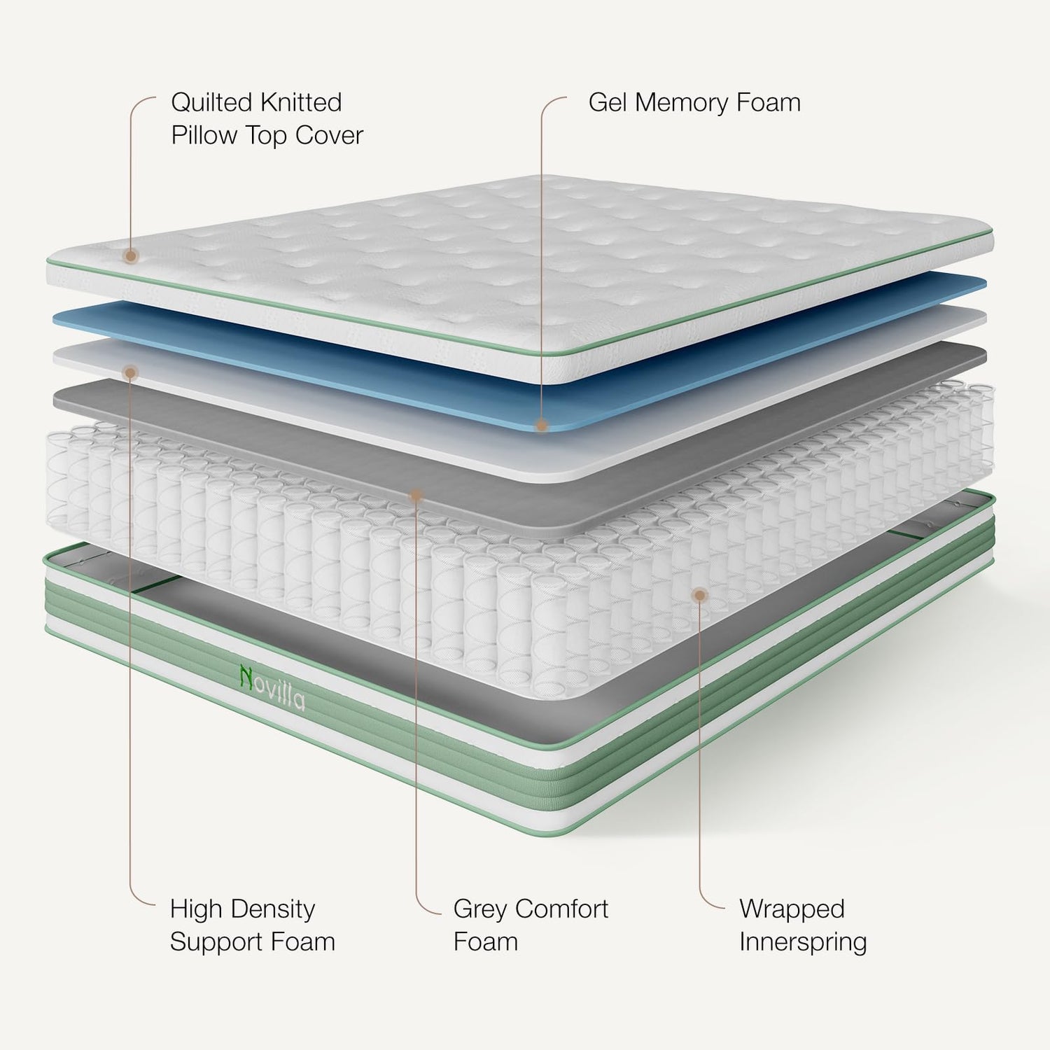 - BALANCE SUPPORT & PAIN RELIEF - The Novilla 12 inch kin mattress features the benefits of traditional innerspring and foam mattresses. With individually pocketed springs, it reduces noise and motion transfer, catering to light sleepers,even weight distribution for pain relief, reduces noise and motion transfer, catering to light sleepers.