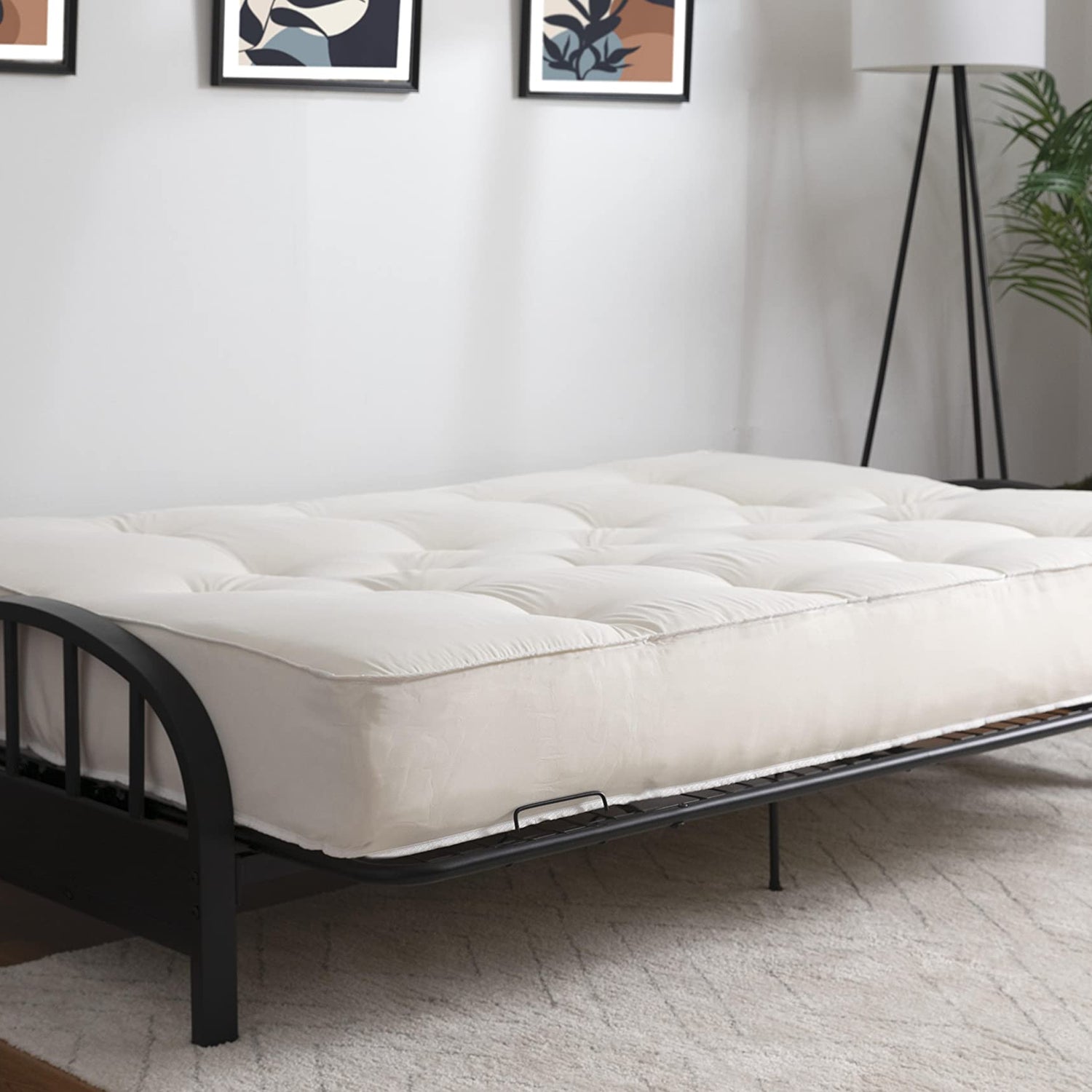 Details: 11MN4 Size: Queen Features: -For use with Bi-Fold Frame or Platform Bed. Specify use when ordering. Tuling patterns vary.-8'' thickness (14'' of overstuffed goods compressed to fit inside a 8'' border).-10'' blend of high quality minimum 2 pound density convoluted and flat foam provides the soft cushy feel of Otis Bed's most popular futon mattress.-Layers of Flame Retardant Rayon insures compliance with Federal Flammability Standard 16 CRF Part 1633.-Machine tufting reduces the thickness of the mattress to lock in its good look and feel.-Flip-able design. Feels the same on both sides.-Compression packaged in a FedEx-able carton.-A pair of Otis Bed Grip Strips are necessary when used on a Bi-Fold frame.-Durability: 10-12+ Year, designed for everyday use. Options: -Custom sizes available. Color/Finish: -100pct polyester fabric (cream color) that breaths, stays cool and comfortable, and repels moisture.-Tape edge process insures a proper fit and finish of the mattress cover. Warranty: -10 Year Limited Warranty against manufacturers defects.