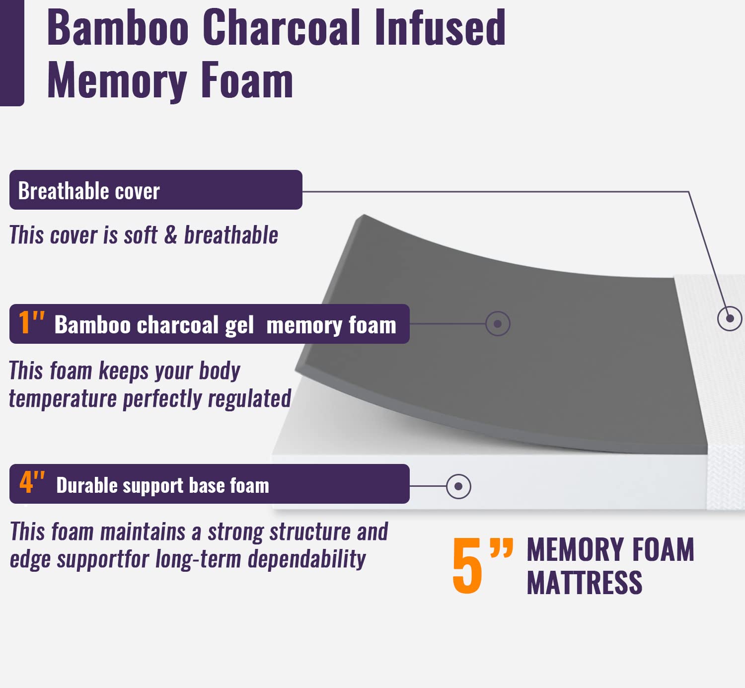 - 【Bamboo charcoal filled memory foam】: Our memory cotton mattress is filled with a proper amount of bamboo charcoal powder, and the high-quality bamboo charcoal soaking solution ensures a clean feeling every night. This gel infused mattress will keep you cool and actively regulate the temperature throughout the night. Our mattress is designed for safety, durability, performance, emissions and content, which will bring you a different sleep experience.