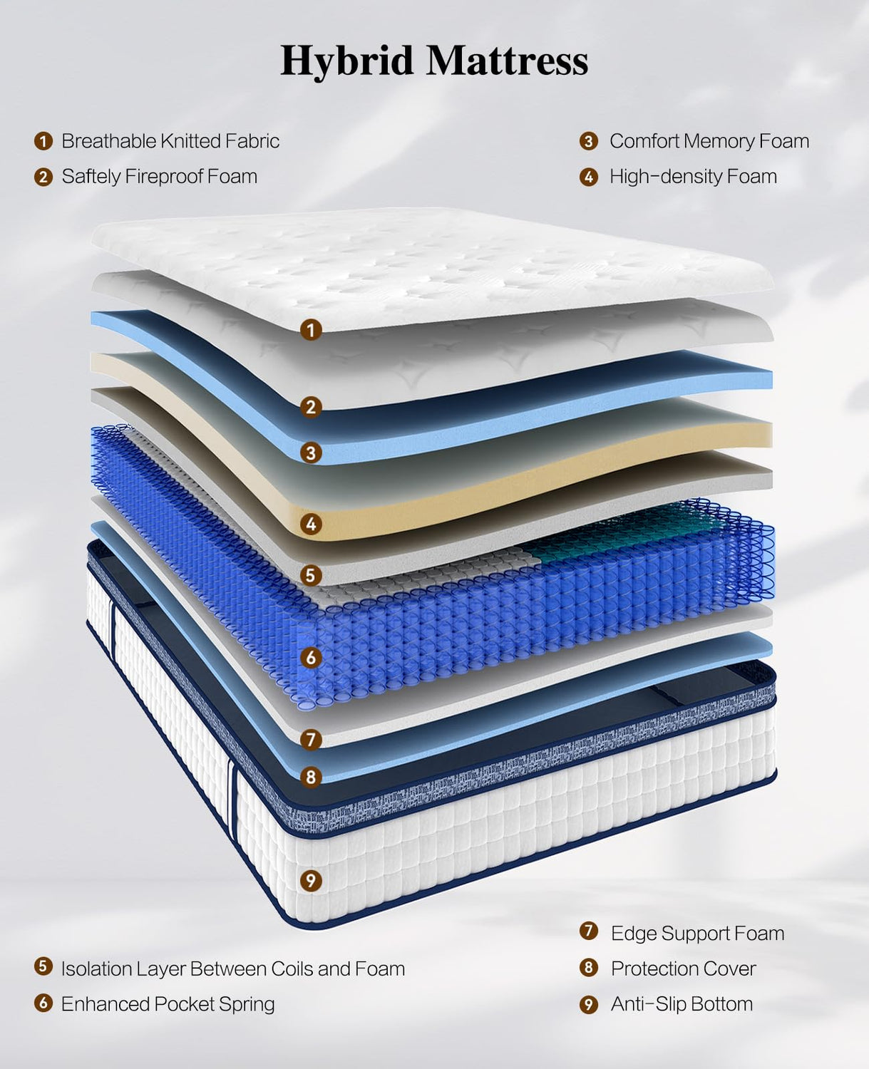 - COMFORTABLE SUPPORT AND SWEET SLEEP: The Twin mattress combines individually wrapped pocket springs with premium memory foam to evenly distribute your weight from head to toe. This design relieves pressure points, reduces body fatigue, and alleviates aches and pains, ensuring a deeper, more restful sleep and significantly improving your overall sleep quality.