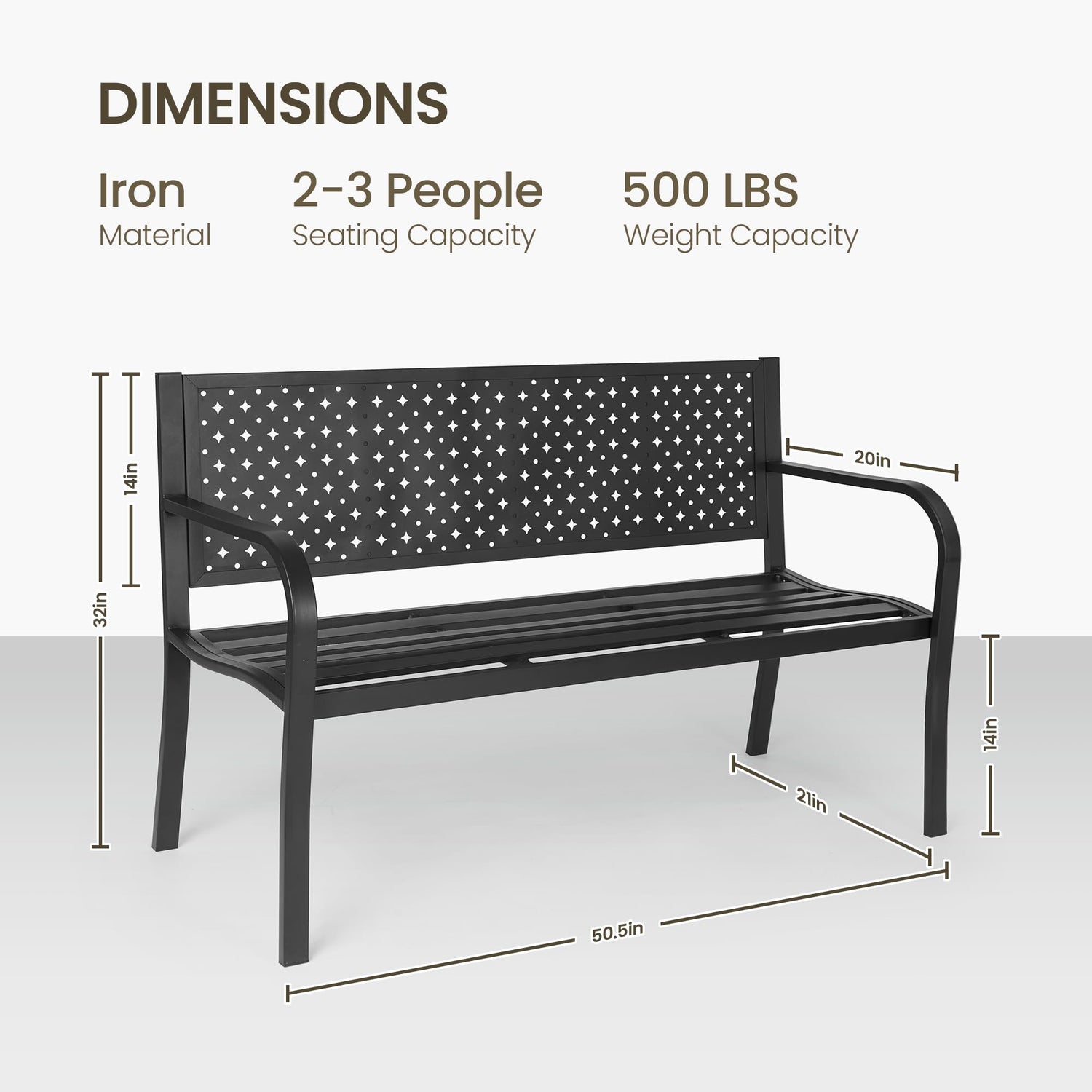 • 【Large Seating Capacity & Superior Stability】Crafted from reinforced, powder-coated steel, this rust-resistant outdoor bench ensures long-lasting durability and all-weather performance. With an Outdoor bench with a 500lb weight capacity, its sturdy 50” x 21” x 32” frame comfortably seats 2 adults, offering reliable safety for gardens, parks, or patios.