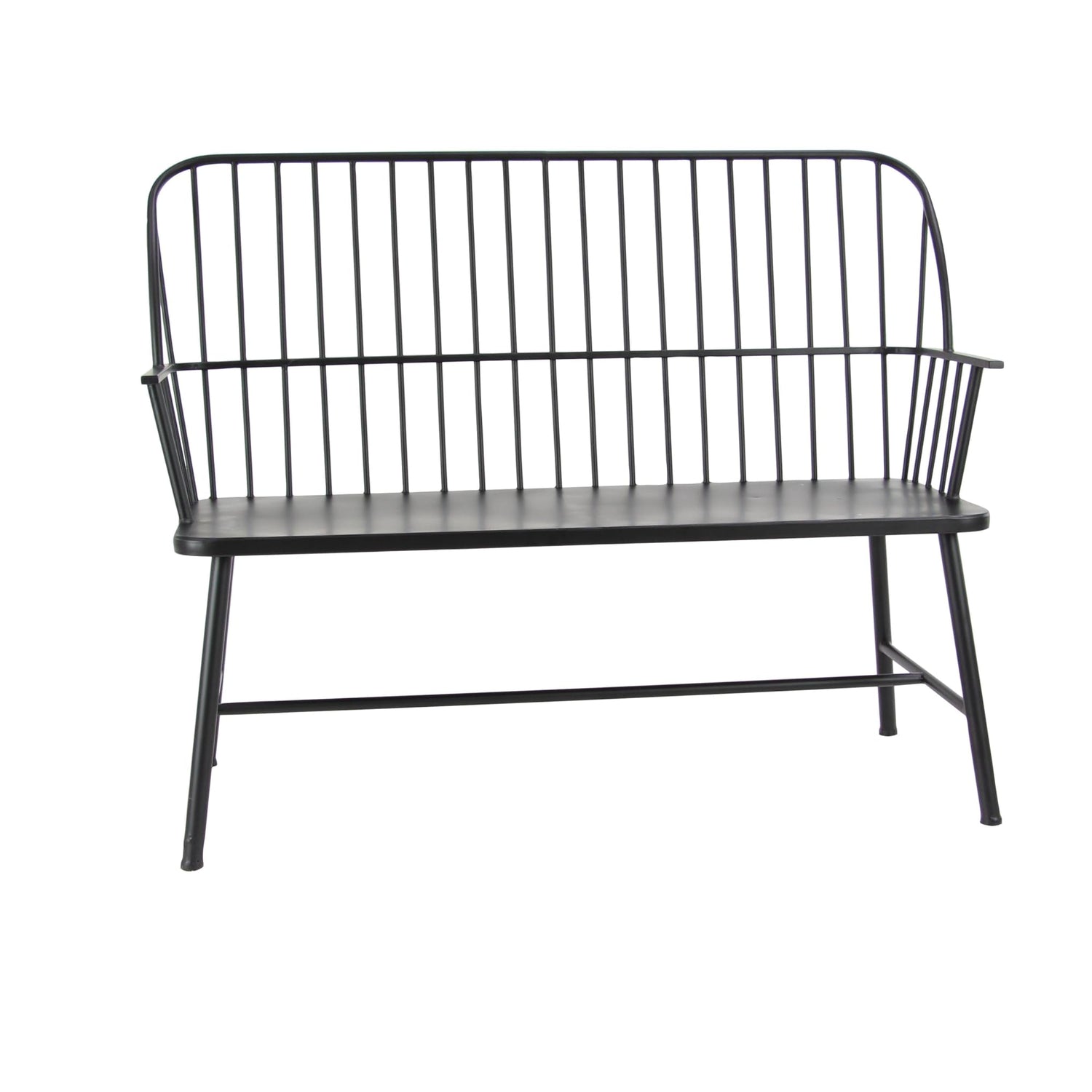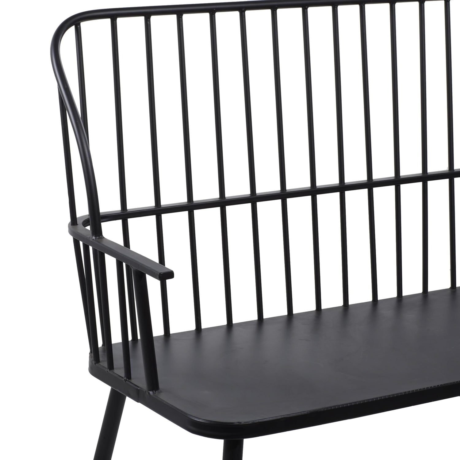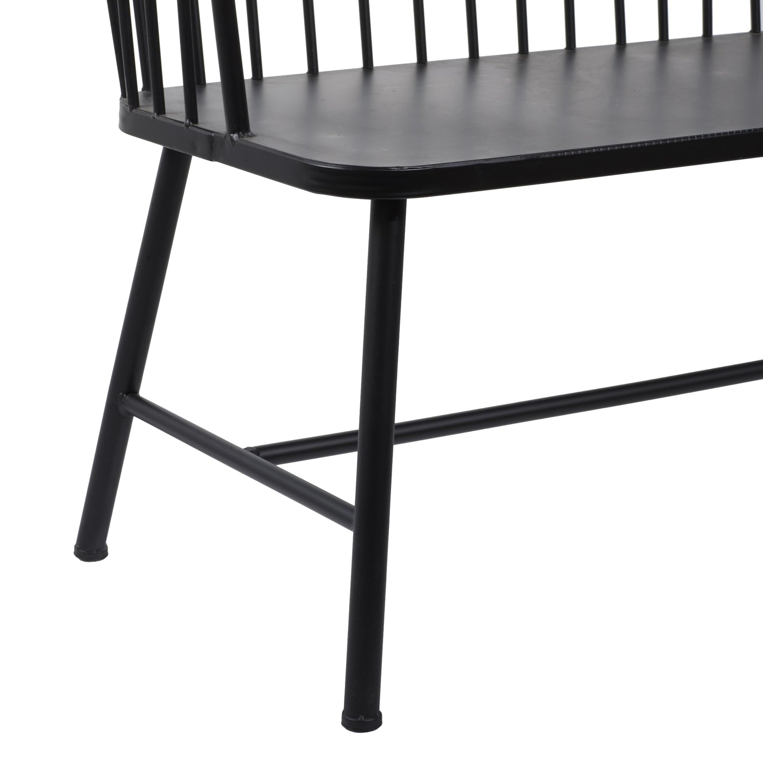 Details: This farmhouse outdoor patio bench relies on secured welding of iron for stability, with its backrest and armrests elevated from the base via 4 legs. Matte black outdoor garden bench boasts a rectangular shape and A shaped legs. Avoid using abrasive cleaning pads or detergents, use a sponge with mild soap and warm water, then rinse with a garden hose. This bench is perfect for creating a focal point in your home with comfortable seating. So take a load off and relax on this decorative outdoor bench. This black patio bench can be placed in patios, complementing light-colored pillows and natural grass baskets. This item ships in 1 carton. Suitable for indoor and outdoor use. This item ships fully assembled in one piece. Maximum weight limit is 400 lbs. Can accommodate 2 people. This is a single black colored patio bench. Farmhouse style. Iron structure is painted with a special coating to help protect it from the elements, iron may show signs of corrosion in salt air environments.