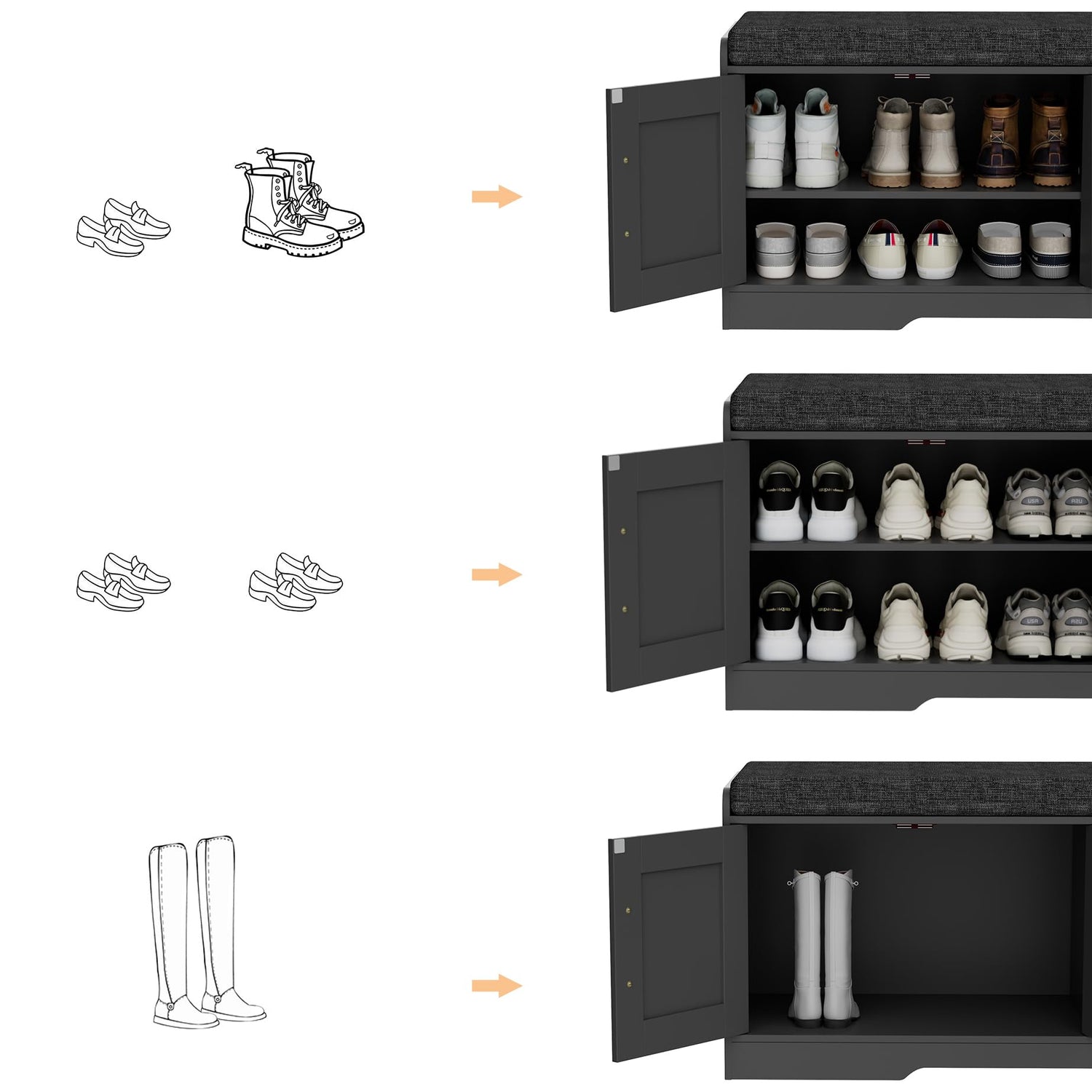 - Keep Your Shoes Organized: The depth of bench is 13.8 inches, which makes it easily to put in your shoes, meanwhile shoes of various heights can be placed by adjusting middle movable boards. The bench doors design ensures not only your privacy, but also a tidy space