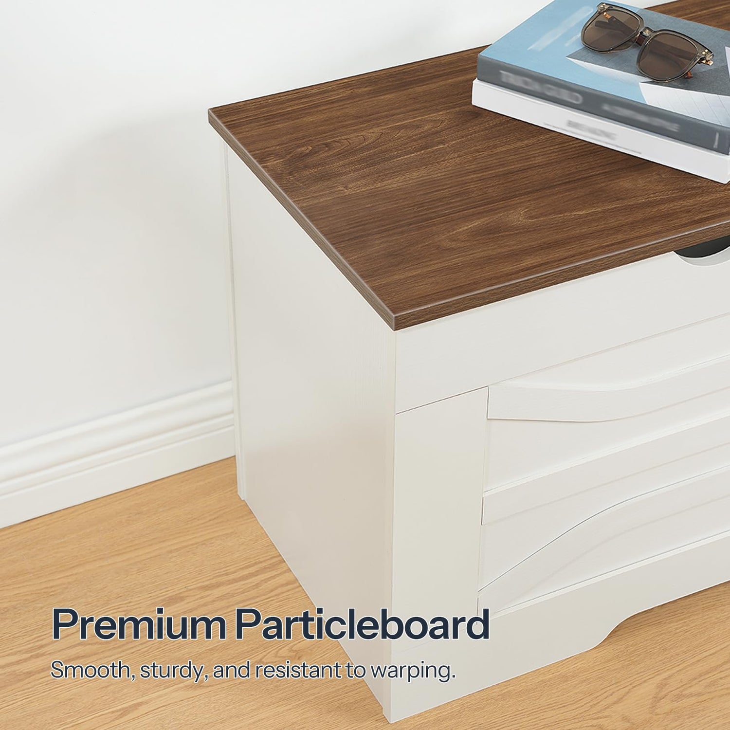 - Premium Particleboard: Built from quality particleboard, the storage chest is sturdy and resistant to warping. Its smooth surface won't snag clothes, and rubber bumpers ensure quiet use and prevent wear and tear, enhancing its longevity