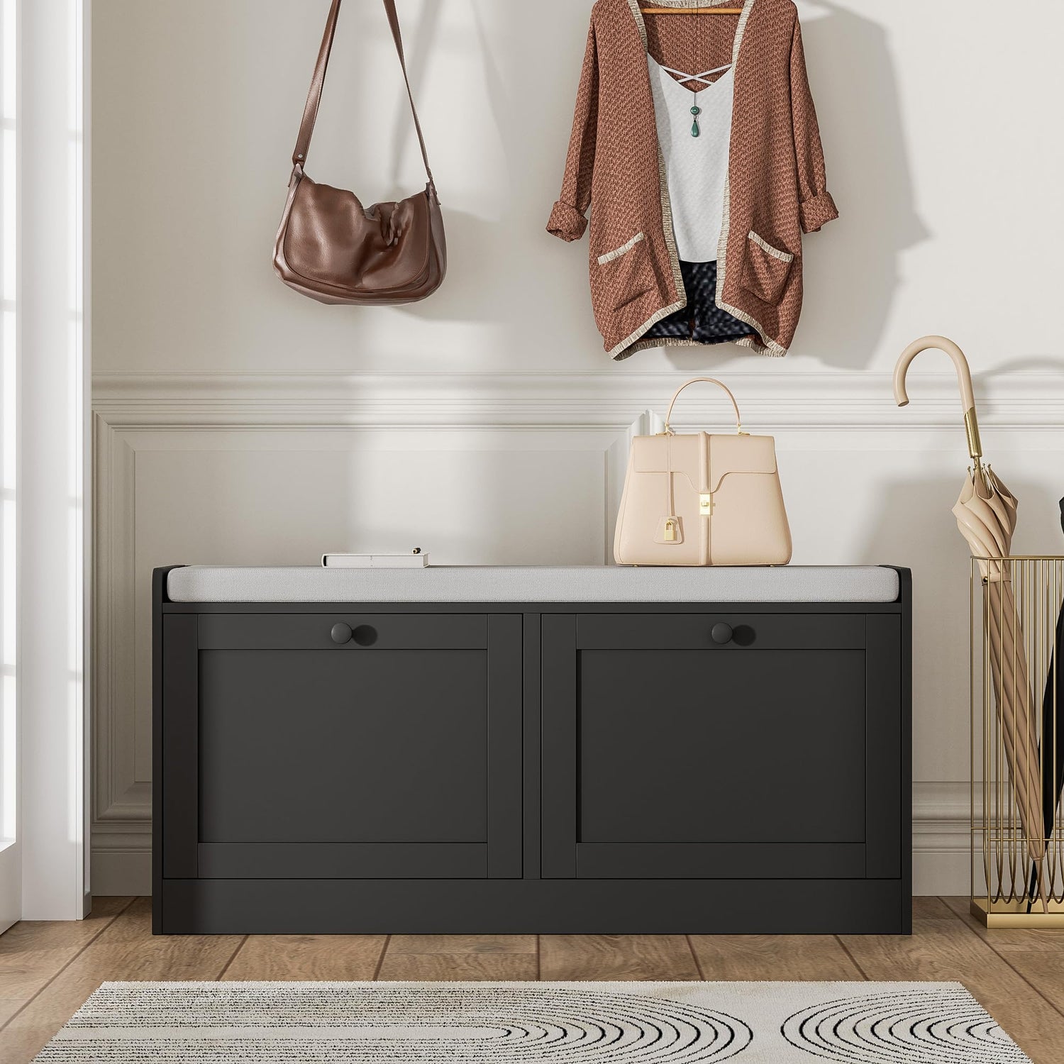 - Durable and Comfortable: Crafted from high-quality wood, our entryway storage bench can support up to 176 lbs while providing a comfy cushioned seat for putting on your shoes. Enjoy lasting durability and comfort all in one chic package.