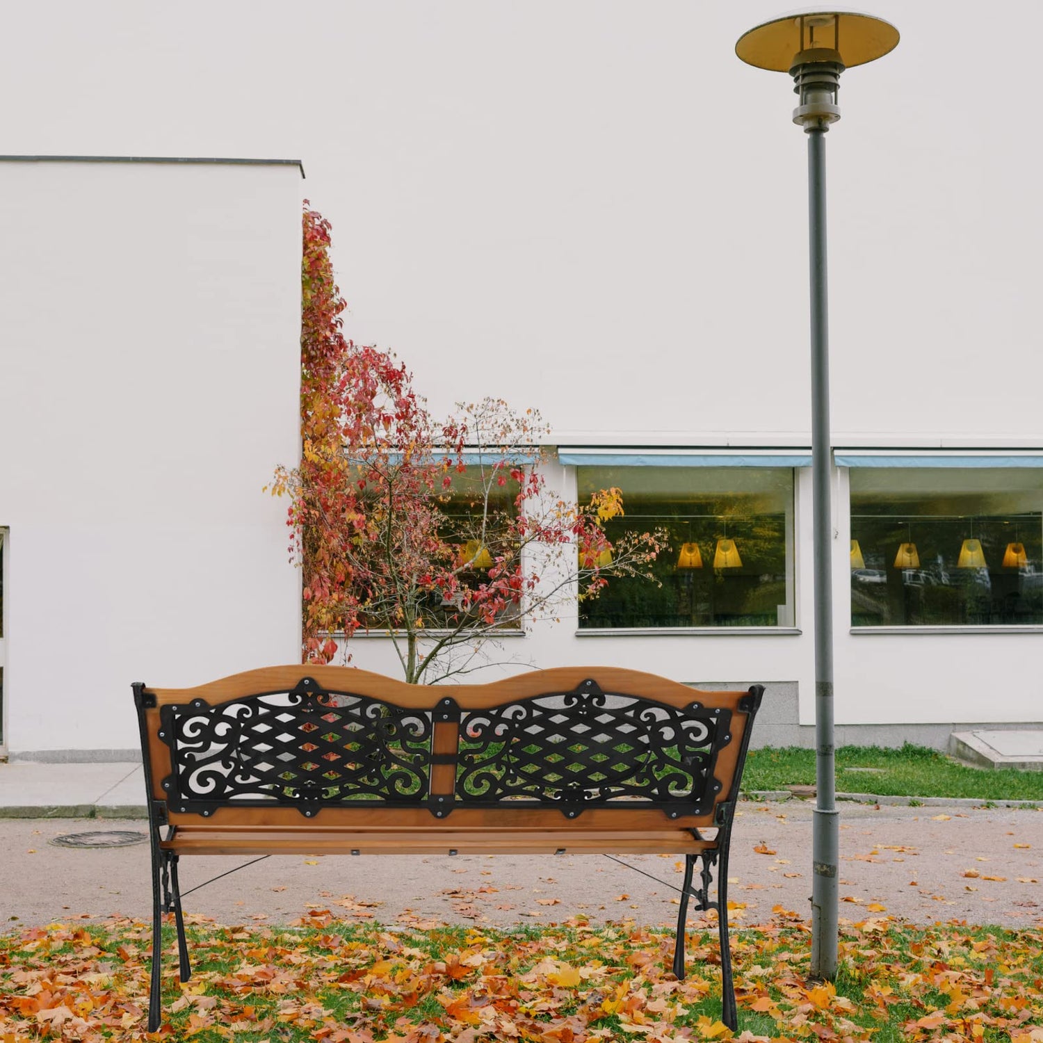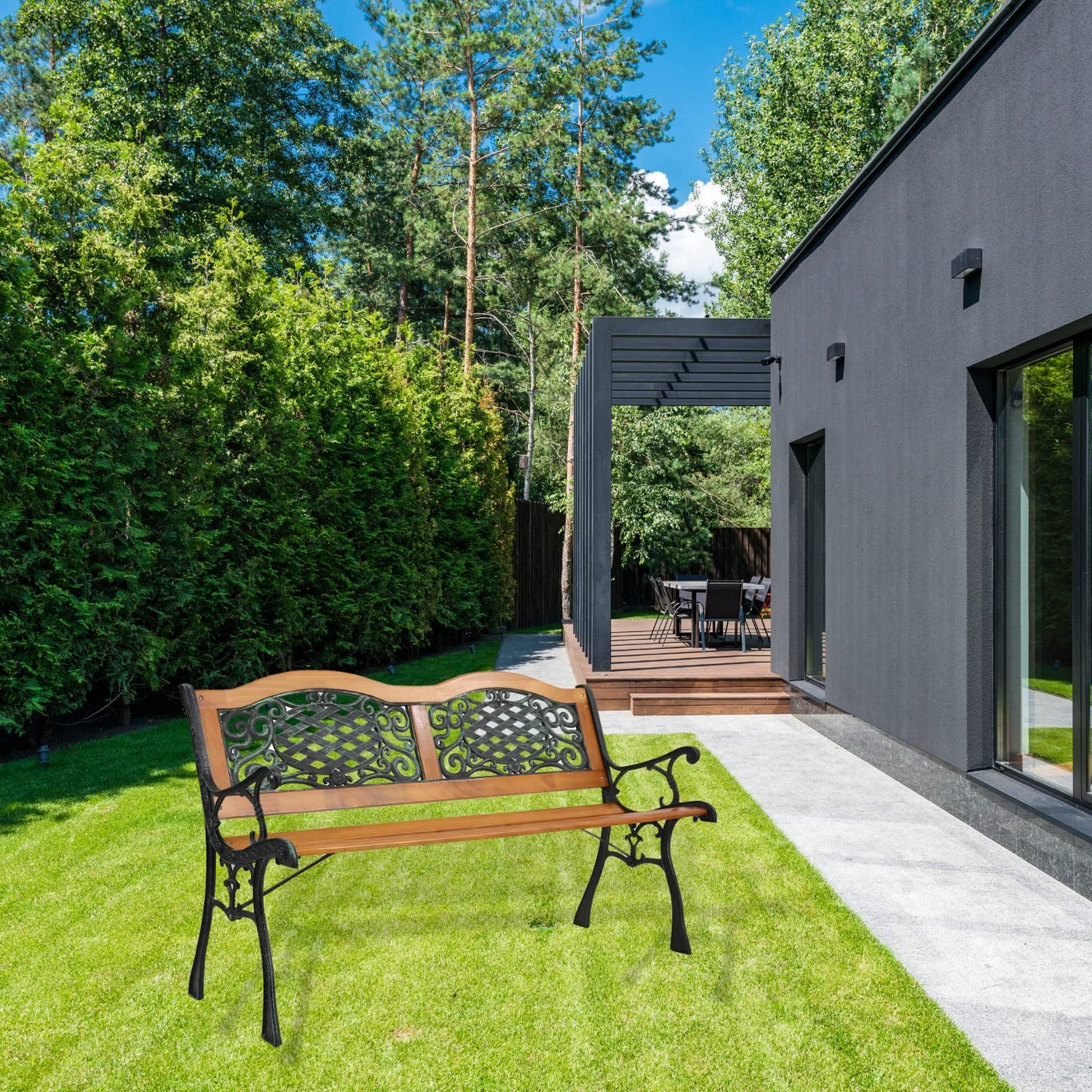 • 【DURABLE AND WEATHER-RESISTANT】Made of reinforced steel and coated with weather-resistant material, this patio garden bench is built to last. The board of the chair is made from FSC-Certified wood. The PVC backrest pattern also prevents rusting.