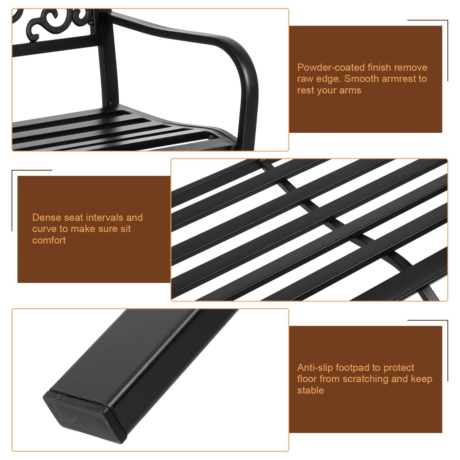 - 【STURDY & RUST-RESISTANT】The patio garden bench with powder-coated finish is weather-resistant. It's made of reinforced steel and plastic backrest. Plastic end-cap on four legs is anti-skidding to protect your floors from scratches