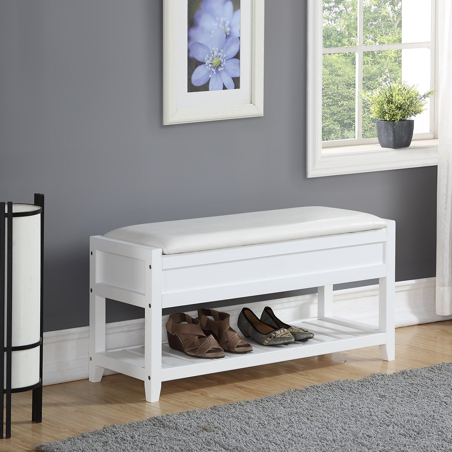 Details: Perfect in the entryway, this Rouen Clean White Seating Bench with Shoe Storage provides a practical place to sit and is loaded with smart storage. Sit on the cushioned seats of this bench or lift to reveal open storage inside. A handy open shelf below is perfect for storing shoes, boxes, and more. The bench is constructed of a clean white wood frame and slatted shoe shelf with white PU leather upholstery and a padded seat cushion. This storage bench has a transitional design that works with any decor and is available in finish options.