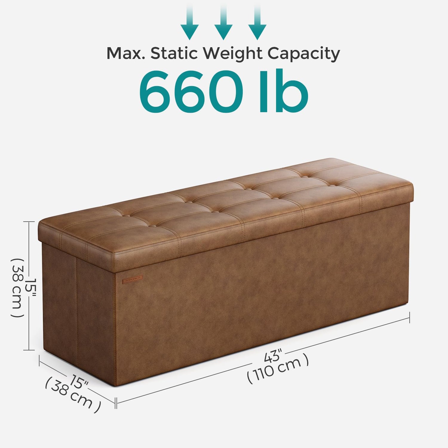 SONGMICS Mazie Collection - 43 Inches Folding Storage Ottoman Bench, Ottoman with Storage, Foot Rest Stool, Load 660 lb, Living Room, Bedroom, Entryway, Synthetic Leather, Coffee Brown ULSF070K01