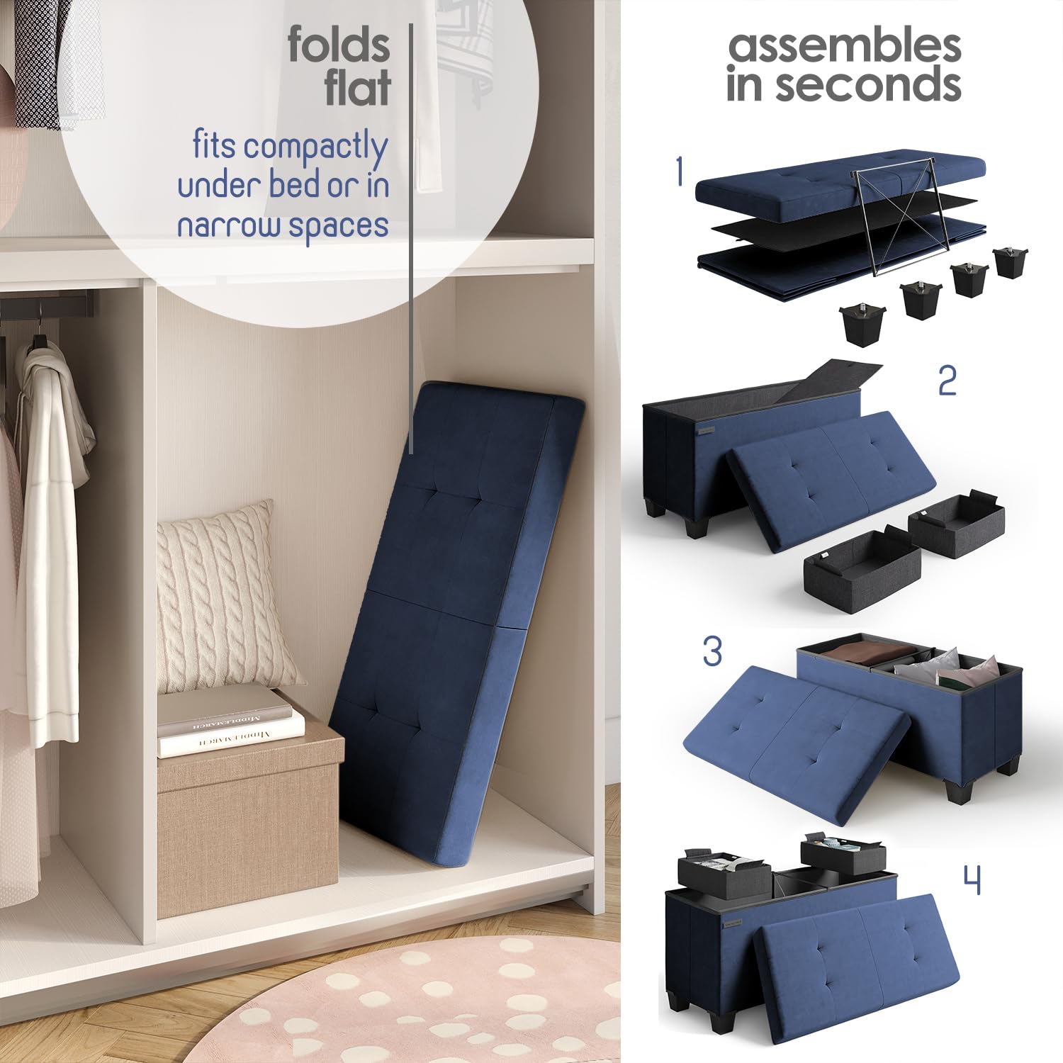 - Removable Legs: Our ottoman storage bench for bedroom and kids’ room can fold flat when not in use and measures 30” L x 15" D x 15” H when fully expanded. Adjust the height by adding or removing sturdy 2" legs, adapting this blue ottoman to suit your storage needs.