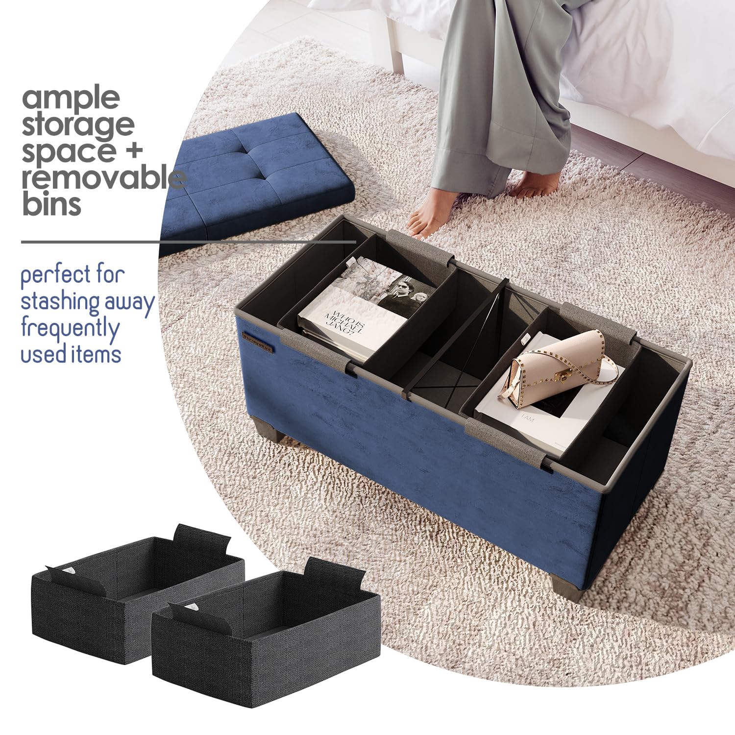 - Two Removable Storage Bins: Keep small, loose items out of sight yet neatly organized with easily accessible storage bins, while the large ottoman space stores bulkier items like throw blankets and pillows.