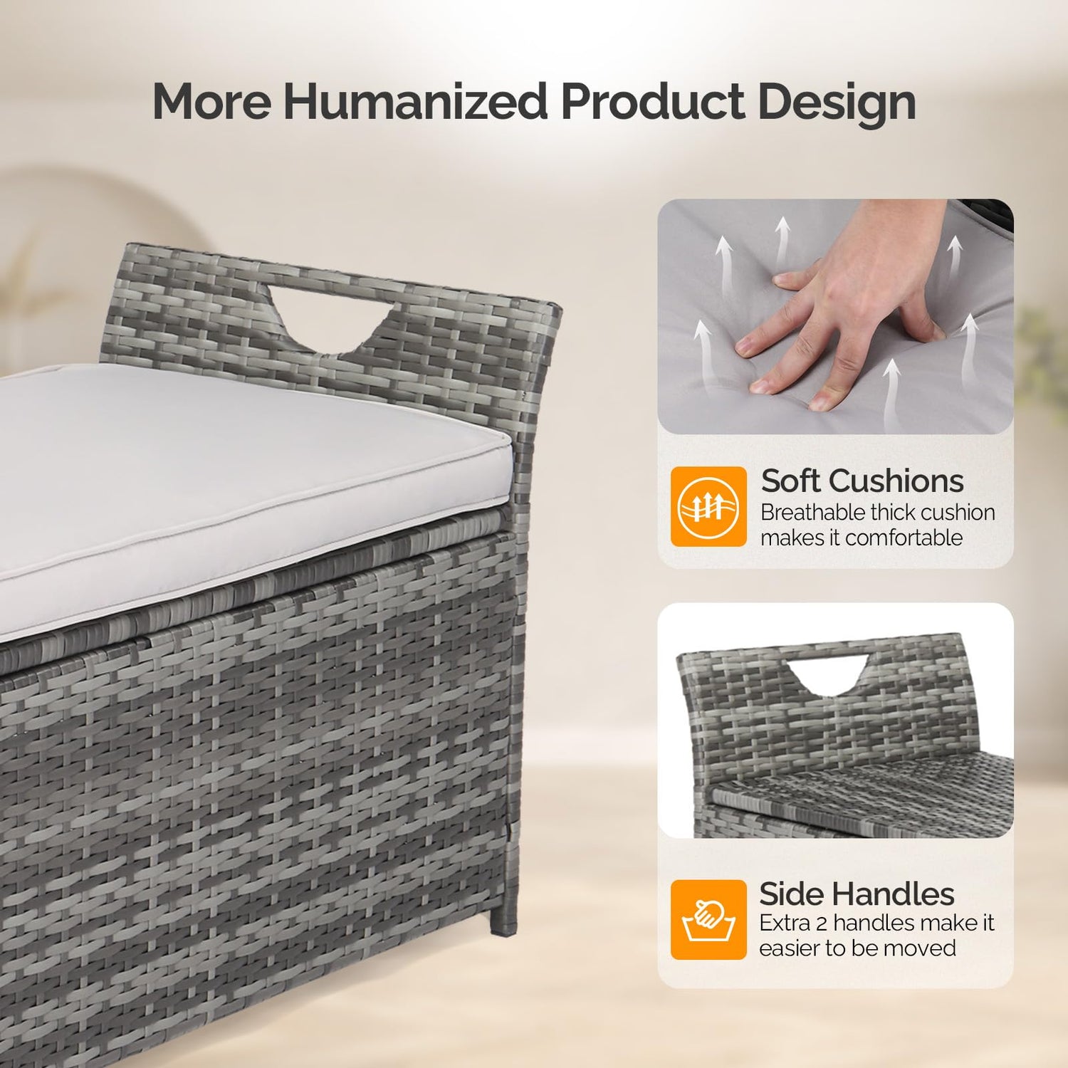 VINGLI 40 Gallon Outdoor Storage Bench with Cushion, Rattan Storage Box, Patio Wicker Deck Box with Seat for Garden | Balcony | Porch | Pool | Yard (Grey Frame + Light Grey Cushion)