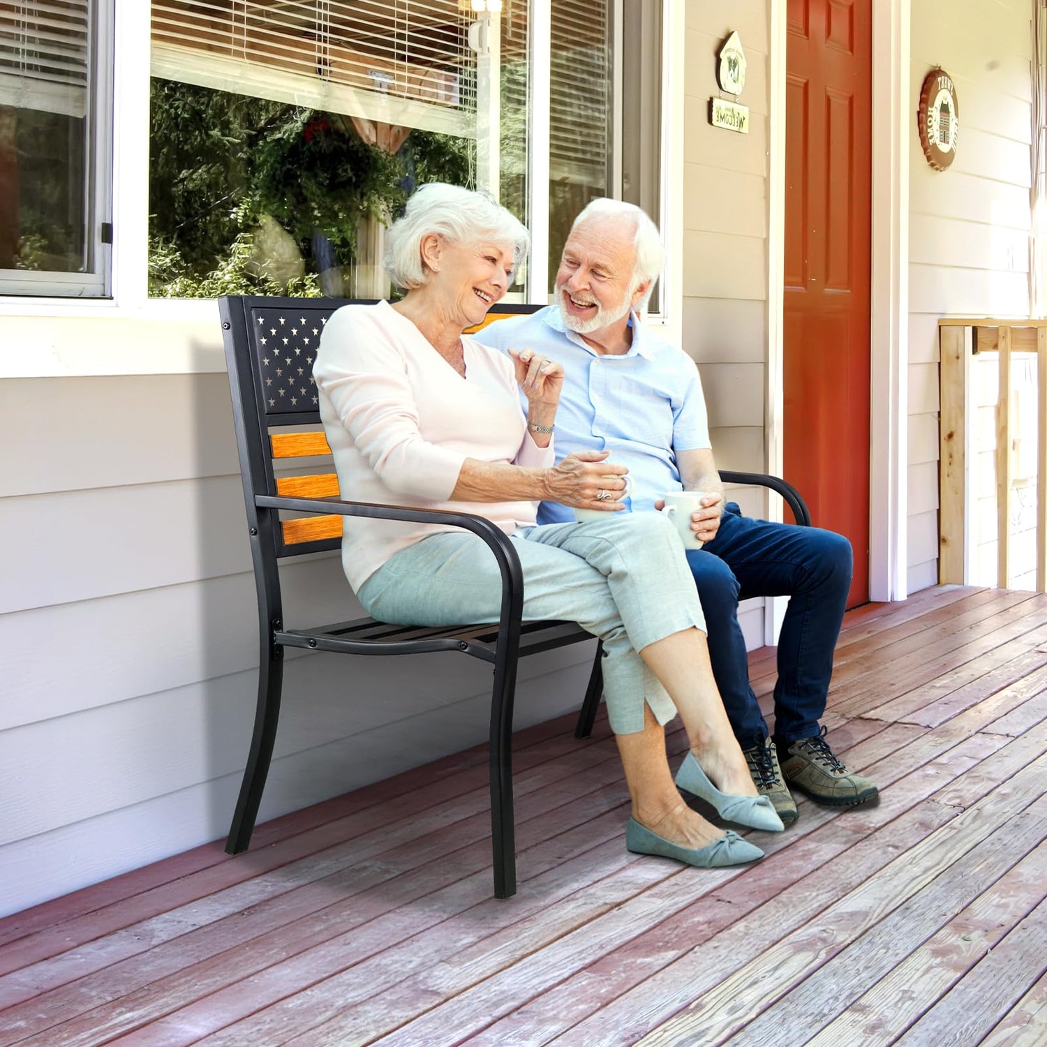 VINGLI Outdoor Metal Bench, 50in Weatherproof Garden Bench w/American Flag Style, 2-Person Sturdy Steel Patio Bench for Front Porch Yard Park
