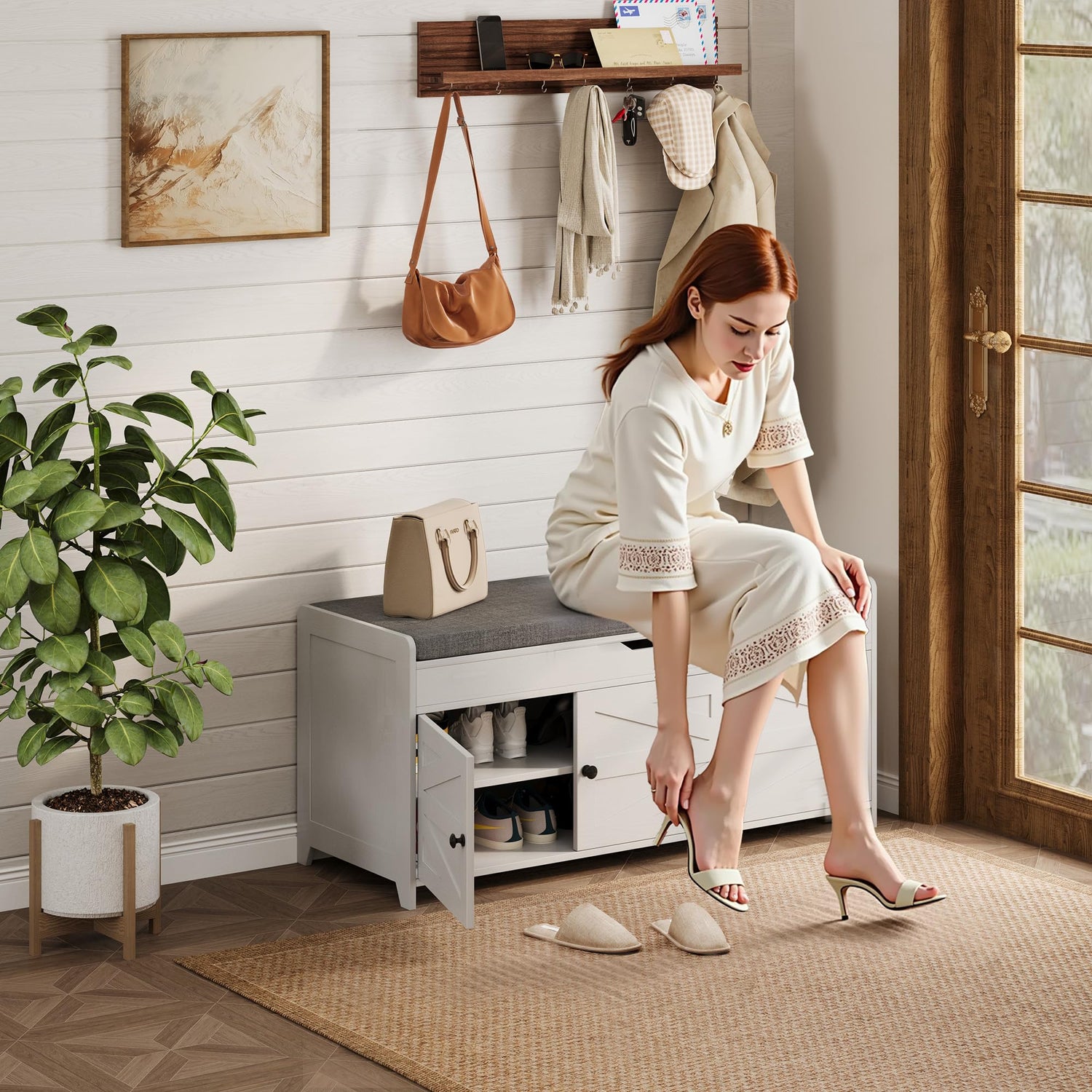 - 【Multifunctional Storage Space】 This storage bench is not just for shoes! Thoughtfully designed to be highly versatile, it seamlessly fits into any room of your home. With multiple shelves and three cabinet doors, it can serve as a shoe cabinet to keep your shoes clean and organized, or as additional storage for blankets, scarves, towels, and more, protecting them from dust