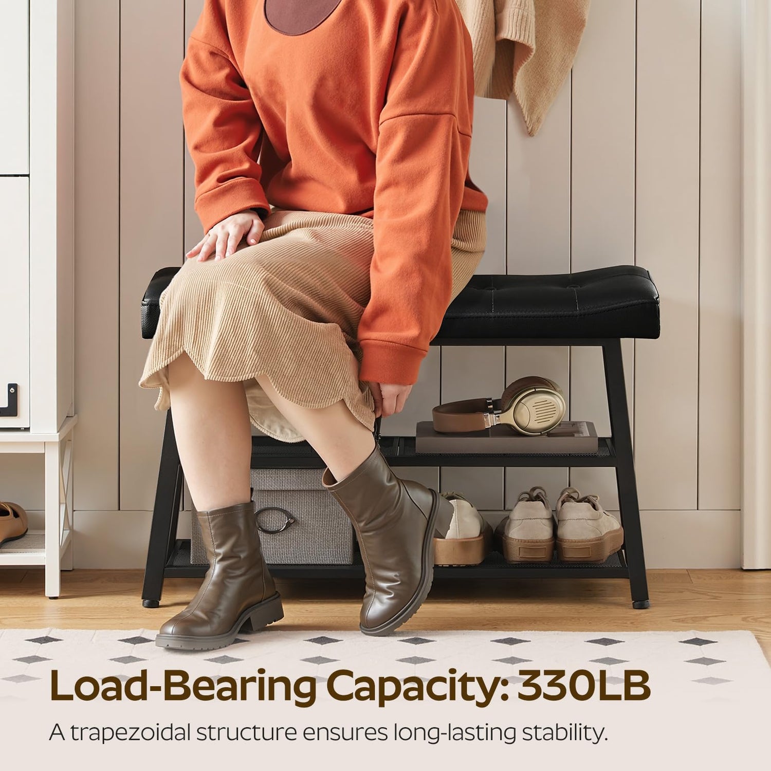 - Sturdy and Enduring: This shoe storage bench is crafted with a smooth PU leather seat that's soft and easy to clean, supported by a trapezoidal metal frame with adjustable feet for enhanced stability. The seat of this shoe bench with storage supports up to 330 lb, and each mesh rack tier holds 22 lb