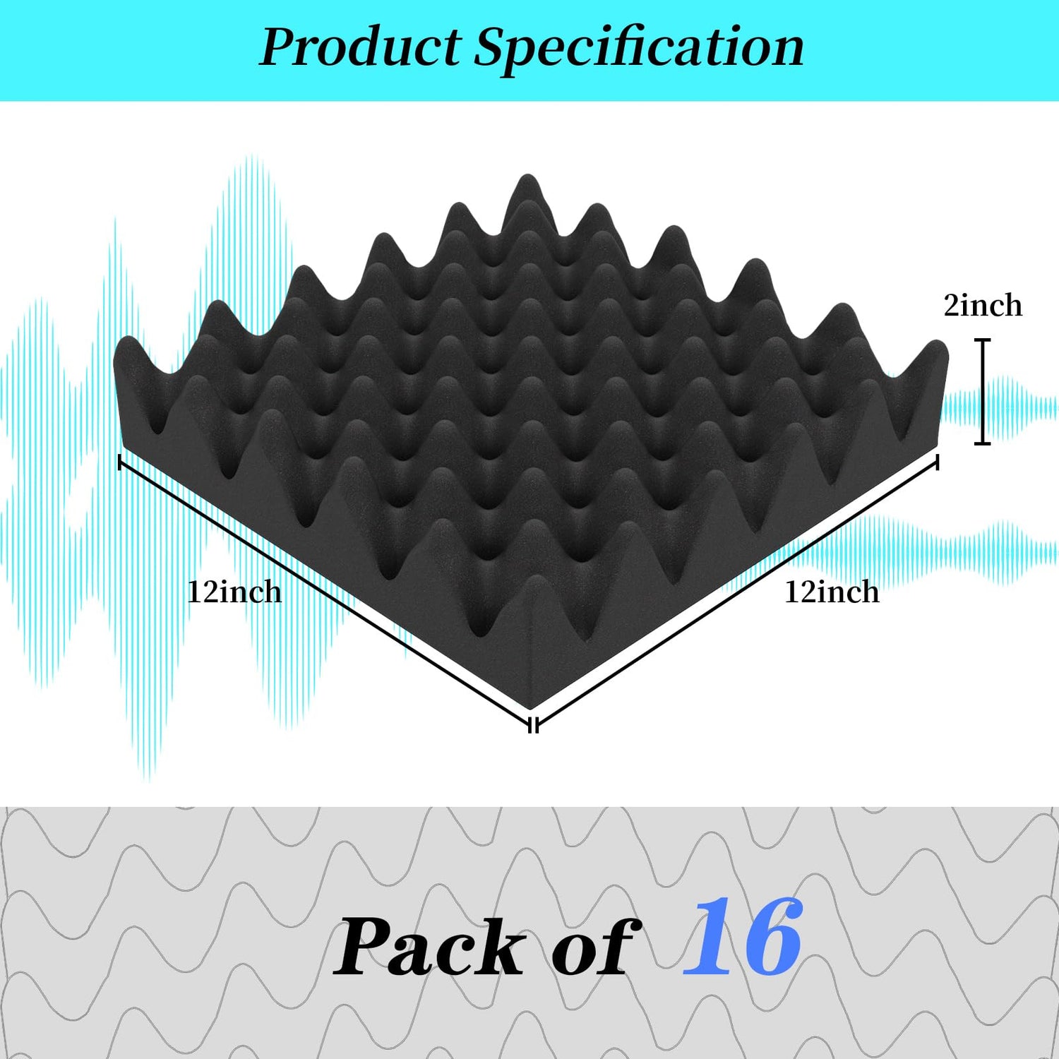 16 Pack Acoustic Foam,12x12x2 inches Sound Proof Foam Panels for Walls, Premium Egg Crate Panel Studio Foam Wall Panel (Black)
