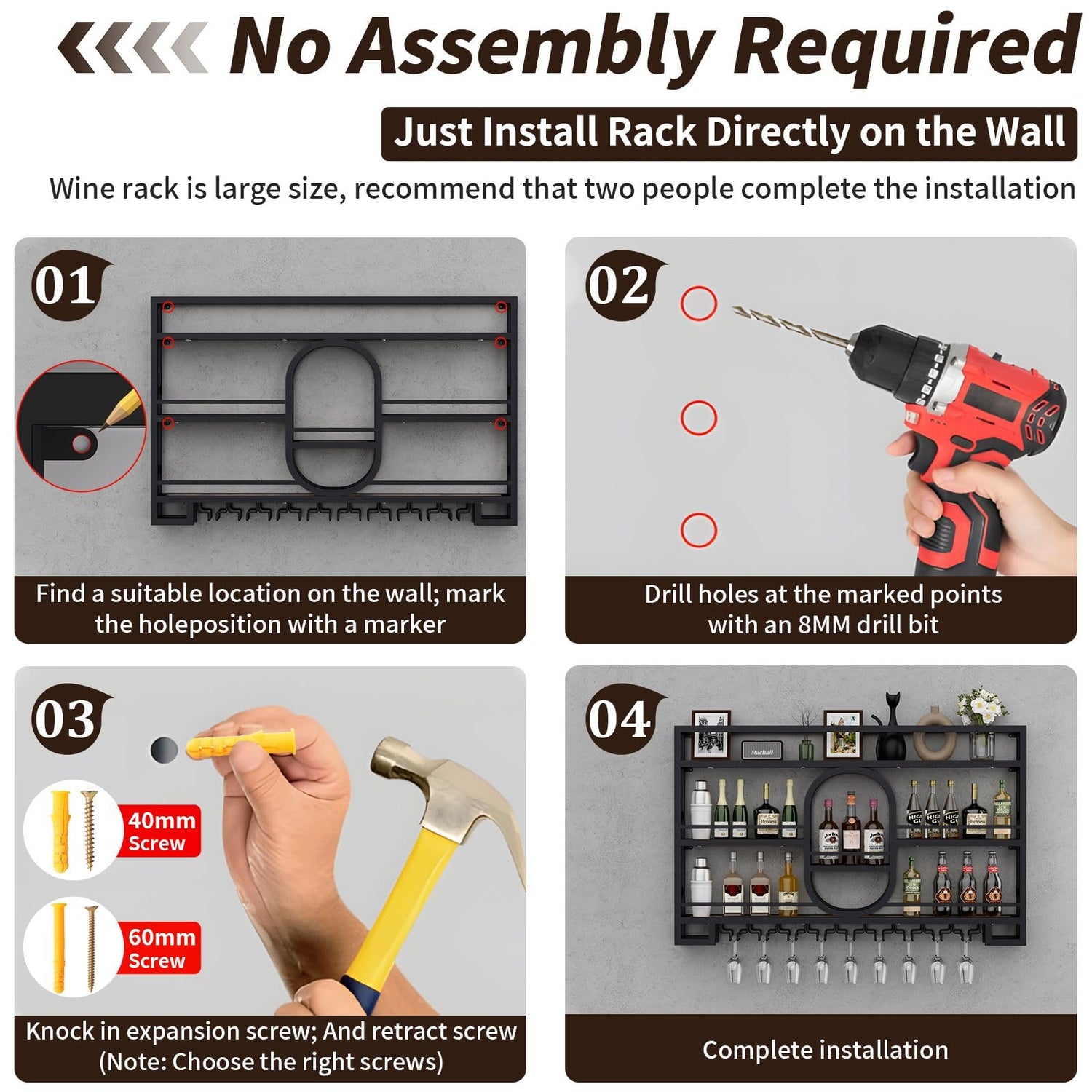 - 【No Assembly Required】Integrated design prevents loose parts during use. Equipped both 40mm and 60mm screws, ensuring perfect fit for walls of any thickness. Installation is quick and easy—just secure the rack to the wall using 6 appropriate size screws.
