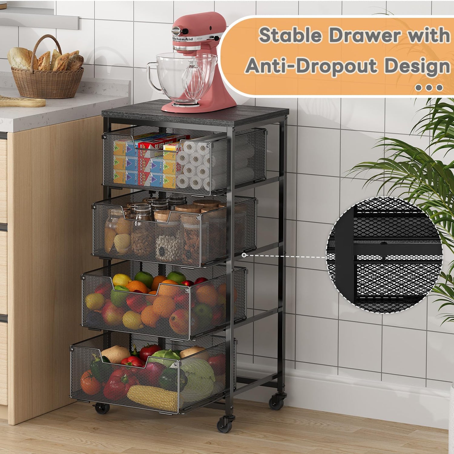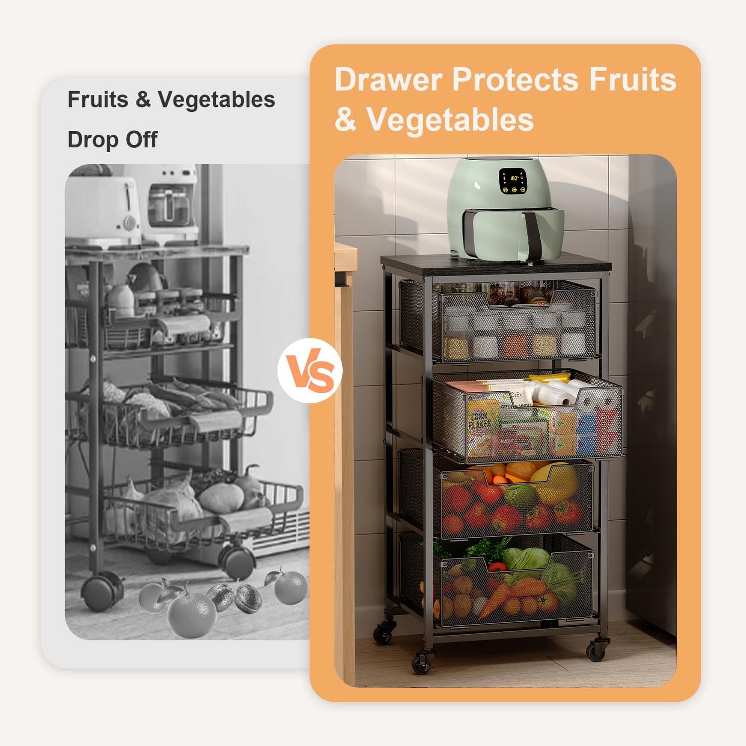 - 【Pull-out Baskets】The wire fruit vegetable basket for kitchen with 4pcs drawers which can storage or pull out the basket, easily take fruit and vegetable out. Meanwhile, the fruits and vegetables can't drop down when you move the metal rolling cart.