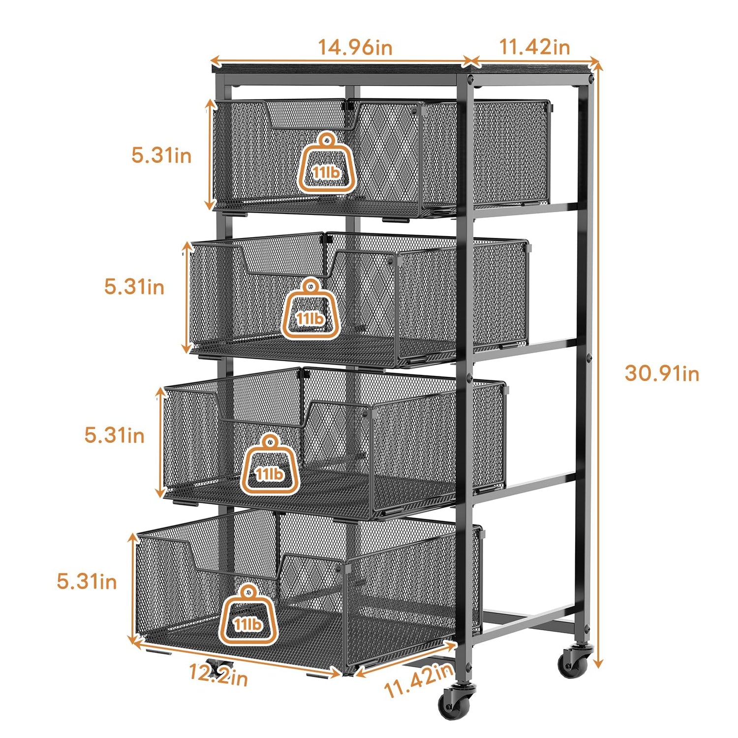 - 【Fruit and Vegetable Storage Cart of Size&Load】The 4-tier fruit and vegetable storage cart is 14.96"D x 11.42"W x 25.76"H. Please confirm the product size before purchasing. Kitchen rolling storage carts hold up to 11lbs per drawer, and you can storage onions/potatoes/cans/ snacks for kitchen.