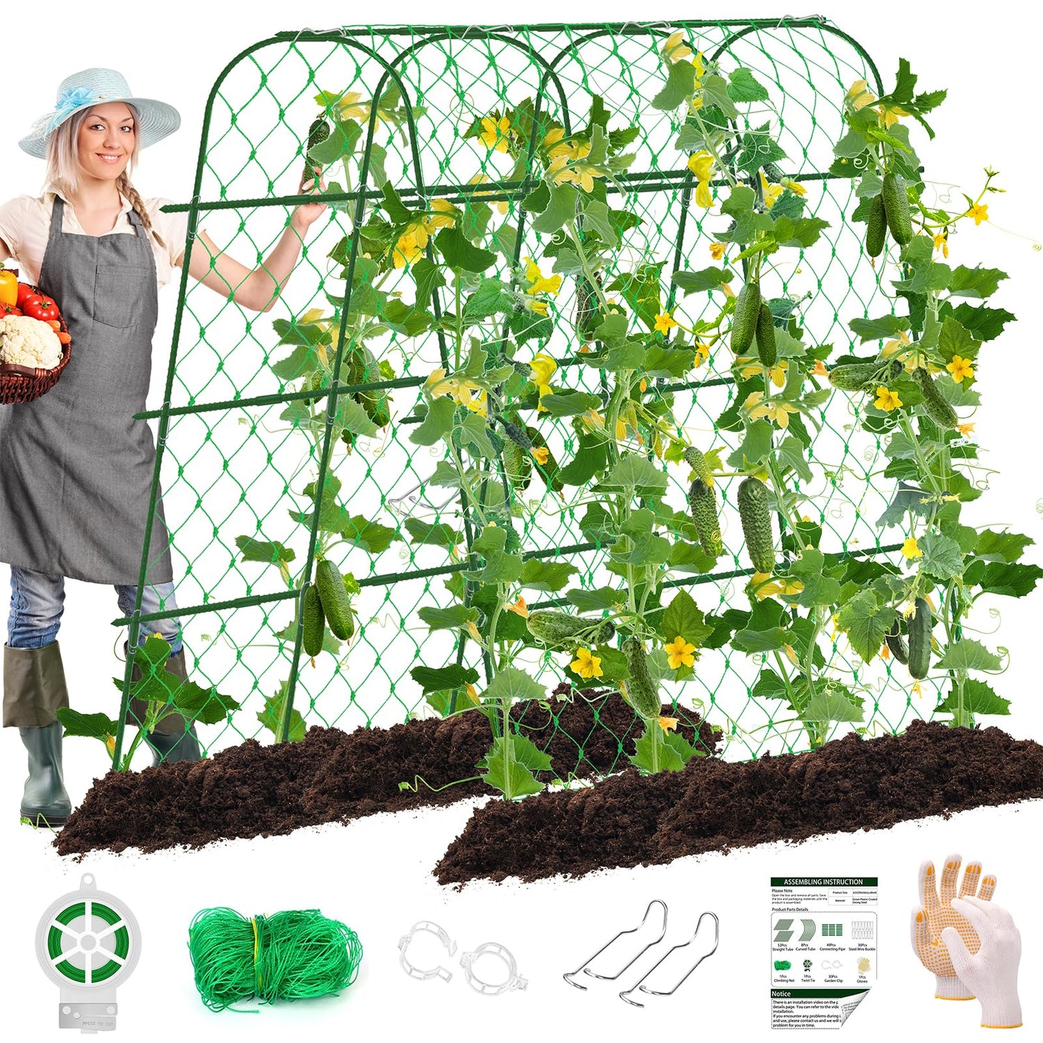 • 【ADJUSTABLE-SIZE】;Cucumber arch trellis including straight stakes*52, curved stakes*8, connect pipes*49, garden clips*30, steel wire buckle*30, 65.6ft twist tie*1, trellis netting*1, gloves*1 pair, installation instructions*1. The maximum assembled size is approx 65"L*47"W*65"H- adjustable width at base is 29-47", height and length can be adjusted as needed,providing optimal support for climbing plants and vegetables and disassembles easily for off-season storage.
