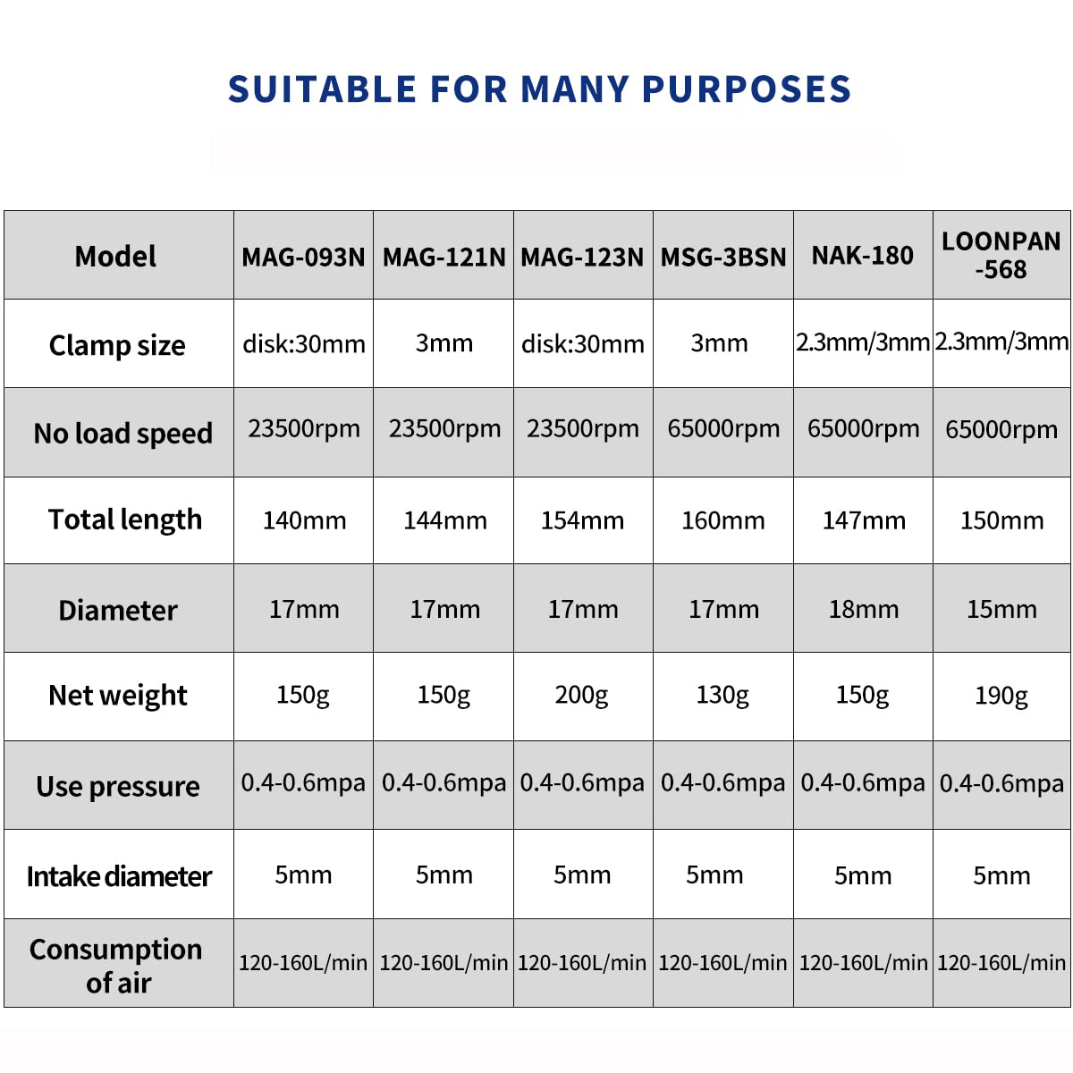 Details: Features:-High quality bearing, long life, improve grinding speed. -The 120-degree grinding machine is designed according to ergonomic principles to make the operation more comfortable. -With angular grinding machine, the advantages of the grinding machine reduce the noise problem during machining. -Portable pen type structural design, with small volume, high speed, low noise, large torque, low energy consumption, smooth and lighter, etc., it is easy to operate. -It is widely used in all kinds of moulds, hardware tools, self-adhesive sandpaper, bowl sand wheel, self-adhesive wool film and so on. -Used for Glass, stone, arts and crafts, hand ornaments etc Need to be trimmed, cut, grind, carve, trim, and need mirror polishing industries. Specification:-Type: 120-degree angle type -Size: 17mm x 150mm x 55mm -Air inlet: 1/4"-RPM: 23500rpm -Air pressure: 90Psi -Working Pressure: 4-6KG -Air consumption:0.08 m³/min -Grinding wheel size: 30mm Package Includes:-1 x Air Micro Die Grinder Kit Set as pictures show. -Included the Installation Instruction. Note:-Please be carefully check the goods appearance, size, shape and then compare your original goods before ordering, thank you. -Light shooting and different displays may cause the color of the item in the picture a little different from the real thing. -Since the size above is measured by hand, the size of the actual item you received could be slightly different from the size above. Please don't mind, thank you!