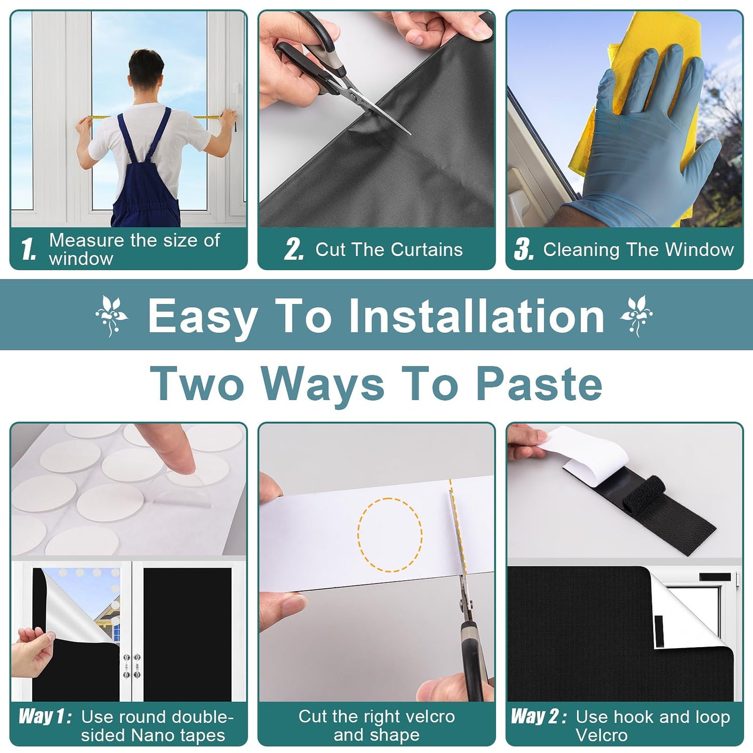 • Easy To Cut, No Drill: 118" X 57" black out blinds for window, can be easily cut into any size and shape, for blackout shades for bedroom windows, we offer two ways to paste blackout blinds for bedroom windows