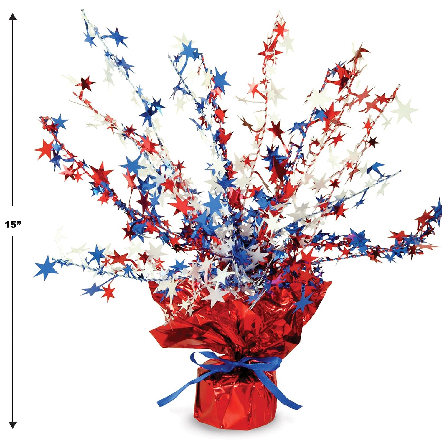 Celebrate in style with the Beistle Star Gleam 'N Burst Centerpiece in patriotic red, white, and blue. This festive decoration stands 15 inches tall and features shimmering metallic stars in vibrant patriotic colors of red, white and blue, bringing energy and brilliance to any event. Perfectly suited for Fourth of July parties, Memorial Day gatherings, or any other USA-themed celebrations, this centerpiece adds charm and flair to your décor. The weighted base, wrapped in matching metallic plastic, ensures stability while doubling as a stylish accent. For a fuller look, fan out the wire strands to create a stunning display. Crafted from durable materials, this centerpiece can be reused for multiple occasions. Whether placed on dining tables, mantels, or event displays, it serves as a versatile and eye-catching decoration. Add the Beistle Star Gleam 'N Burst Centerpiece to your patriotic party essentials for a dazzling display that will leave a lasting impression.