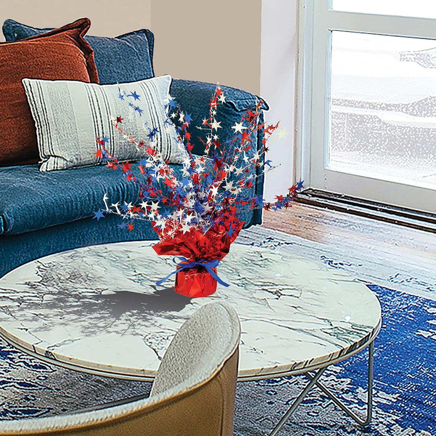 - VIBRANT PATRIOTIC CENTERPIECE: Add color to your patriotic celebration with this fun Star Table Centerpiece. This metallic red, white, and blue decoration will add an exciting focal point to your American holiday display.