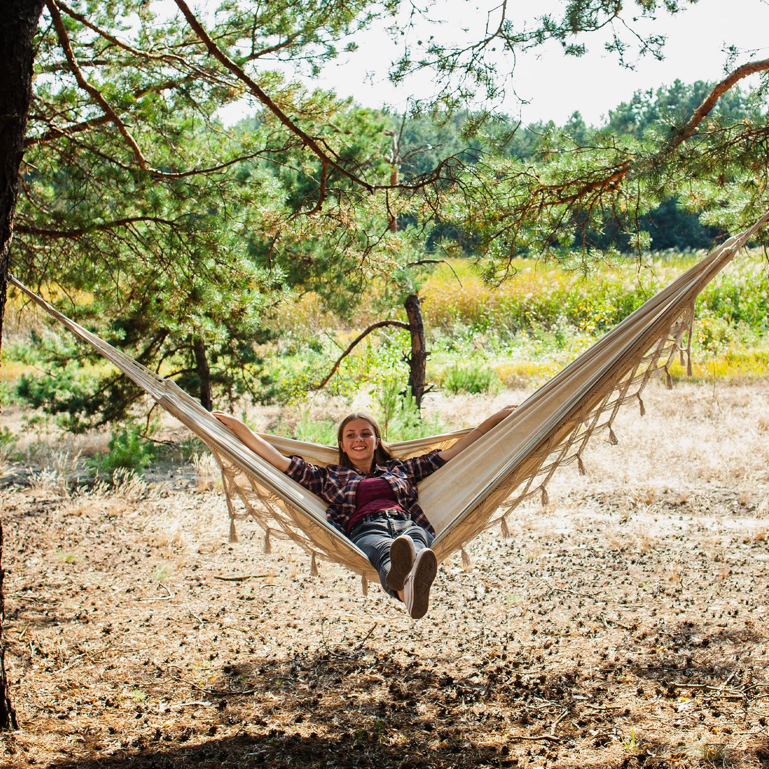 • ๐’๐ฎ๐ฉ๐ž๐ซ ๐ƒ๐ฎ๐ซ๐š๐›๐ฅ๐ž ๐…๐š๐›๐ซ๐ข๐œ - Made of 320g/m2 thick canvas, this super durable hammock can definitely hold 2 stardard-sized adults (up to 550lb) with the fishtail knitting design on the both ends of itself.