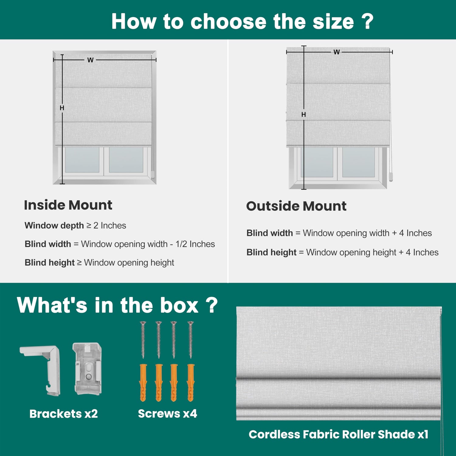 - 【WIDE SIZE SELECTION & EASY MAINTENANCE】With widths ranging from 20 to 98 inches and lengths up to 110 inches, you can custom with ease to perfect fit your windows. Additionally, we offer a variety of colors to match your decor. Our roman shade's fabric section is conveniently detachable using its hook-and-loop top, making cleaning a breeze. Simply dust the shade regularly with a soft cloth or feather duster, and if necessary, spot clean it with a gentle, clean cloth.