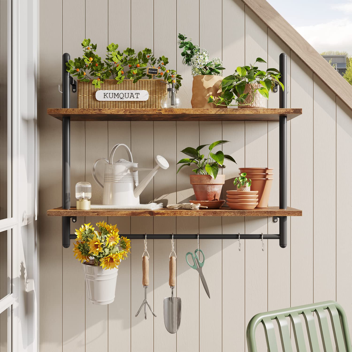 Bestier Pipe Shelf Industrial Floating Shelving 31" Kitchen Wall-Mounted Shelf with Towel Bar Hooks Coffee Bar Shelves Wine Hanging Display Rack Bookshelf Living Room Decor Bathroom-Rustic Brown