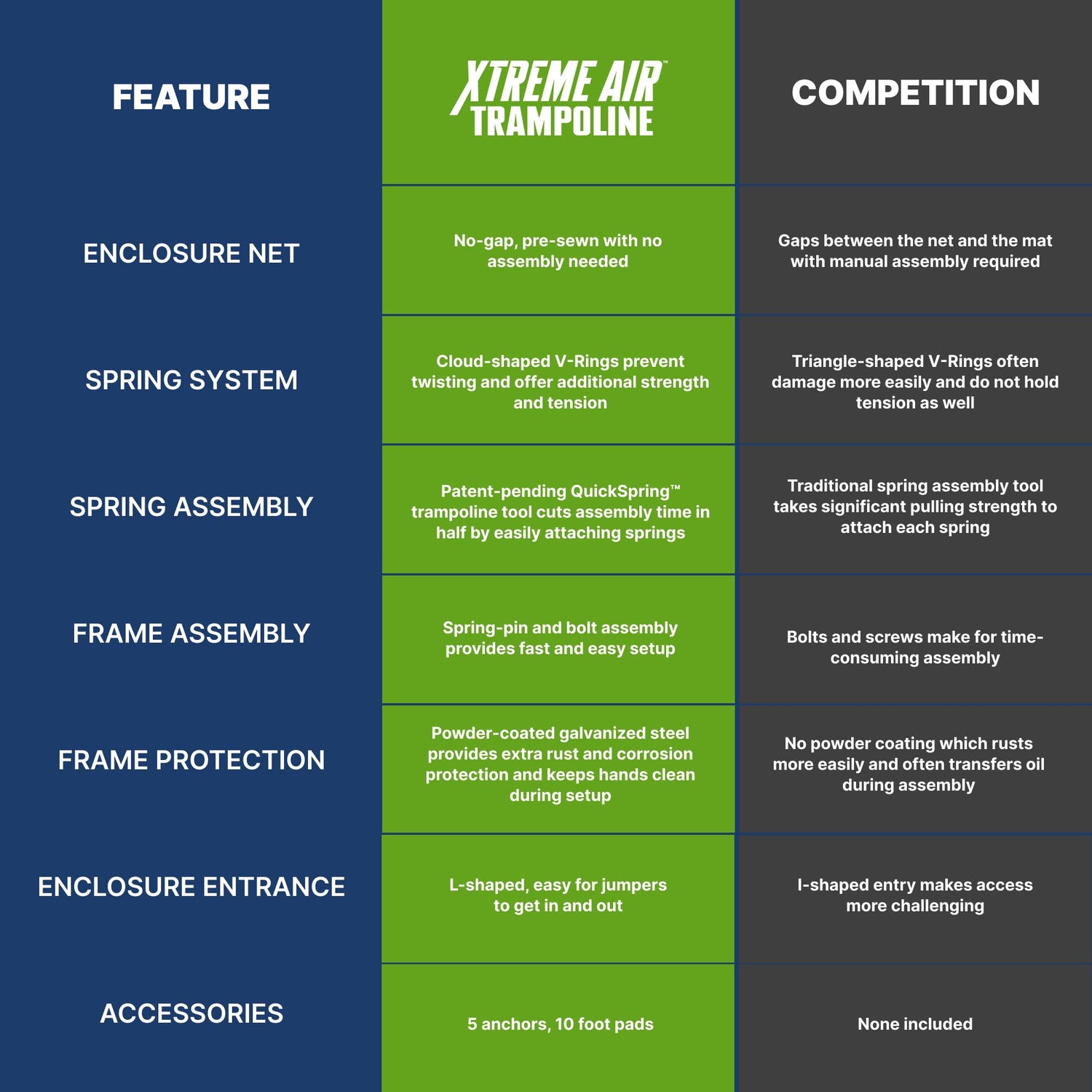 - COMPLETE SET: Comes with everything you need for setup, including trampoline, spring-loading tool, 5 anchors, and 10 foot pads, plus a 2-year limited warranty on the trampoline frame for peace of mind.