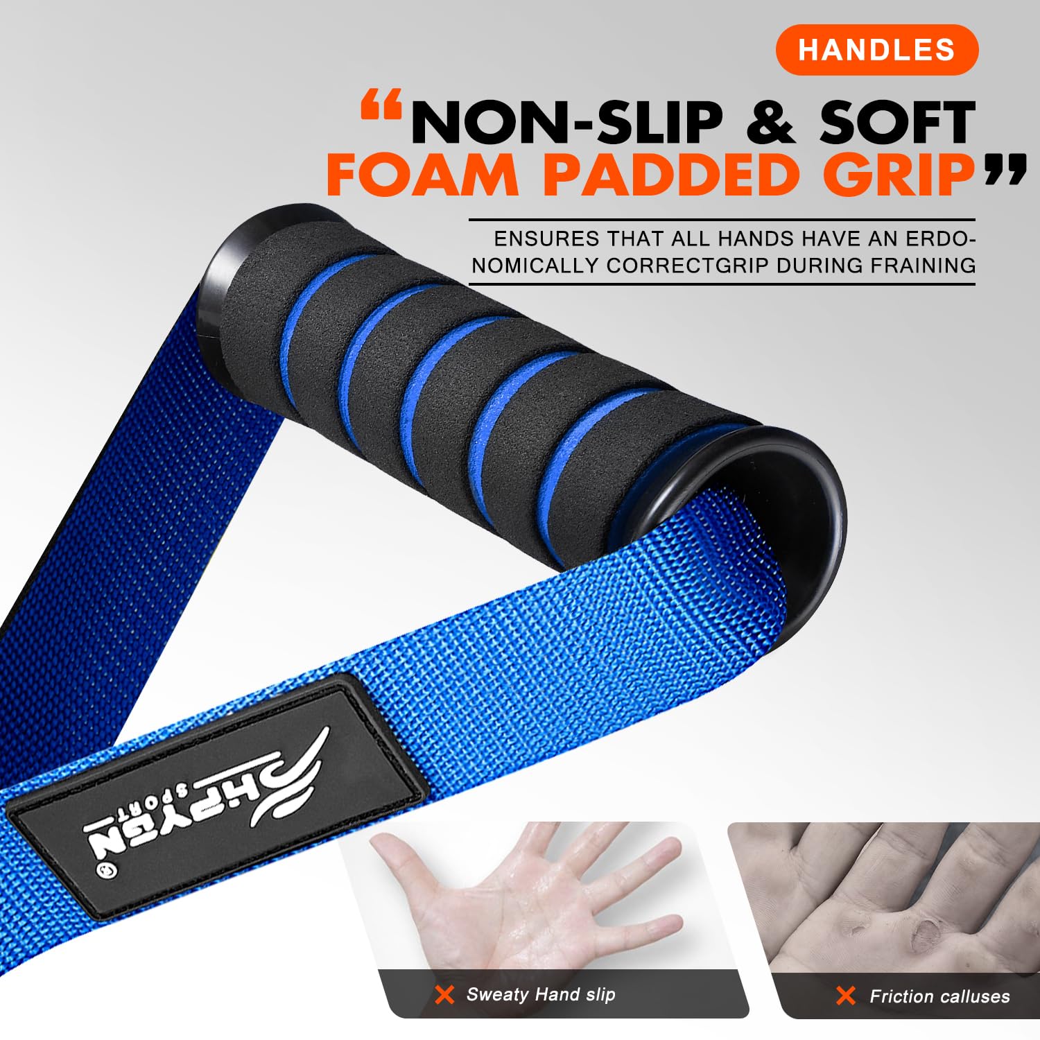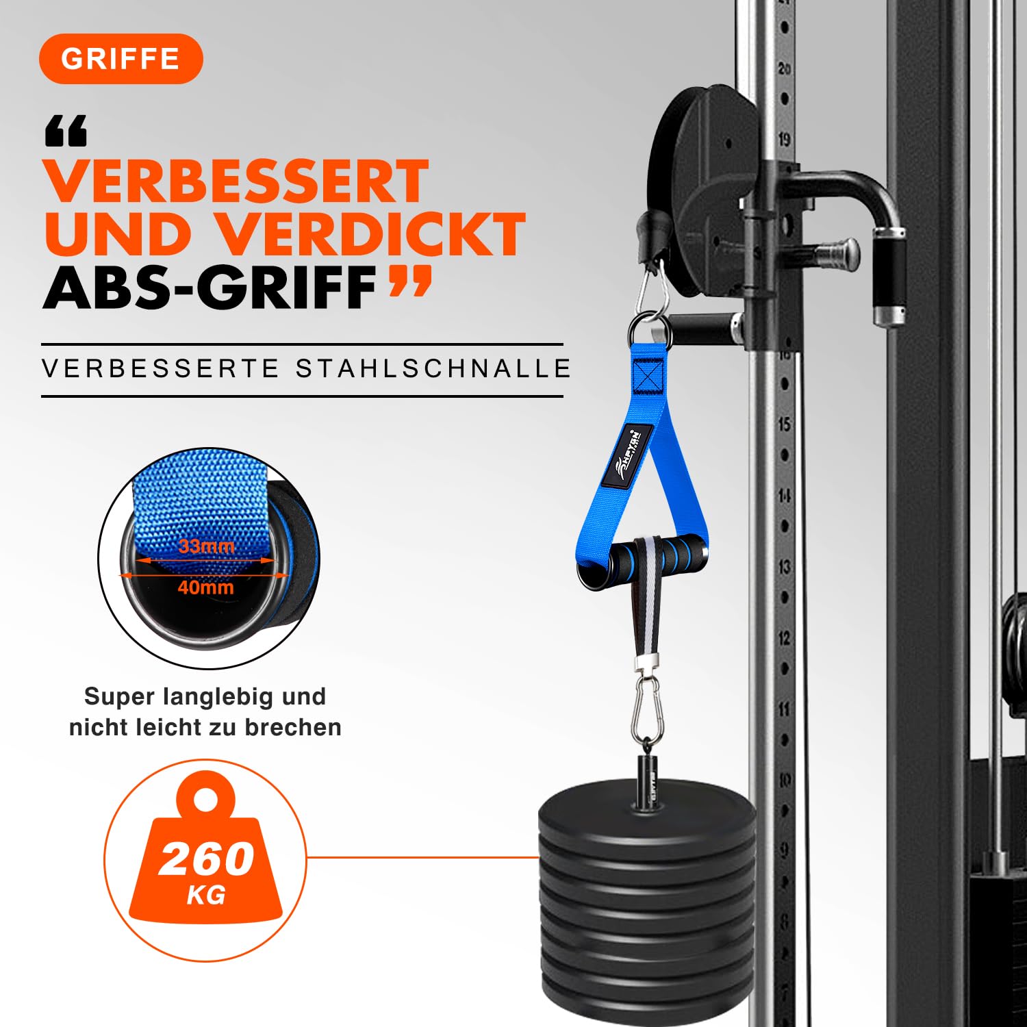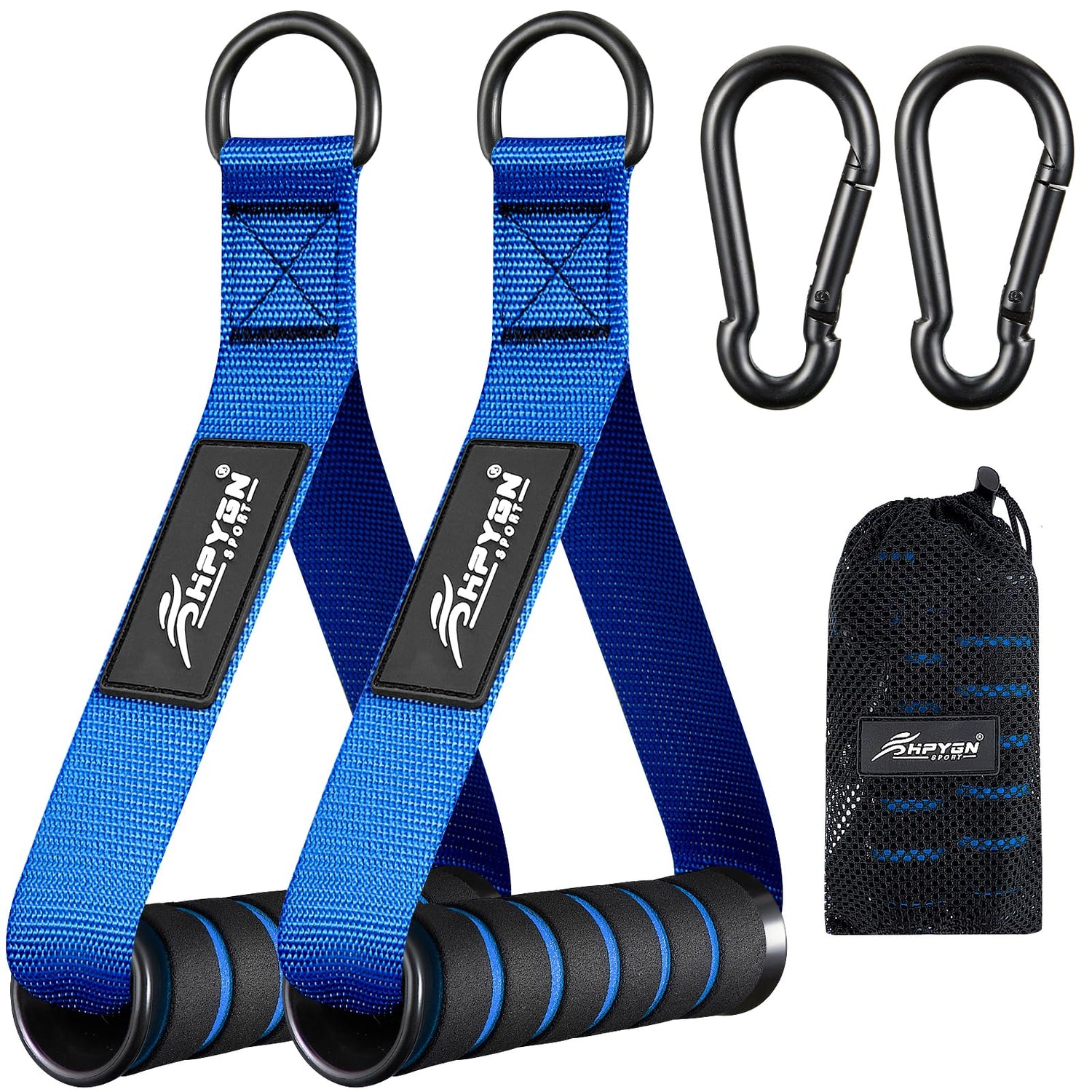 • Premium Quality Materials - Our cable machine handles are thoughtfully designed to conform to the natural structure of your hand, ensuring ultimate comfort and grip. The extra-wide design provides ample space for your hands, while the thick woven nylon webbing and heavy-duty stitching add durability and a luxurious texture.
