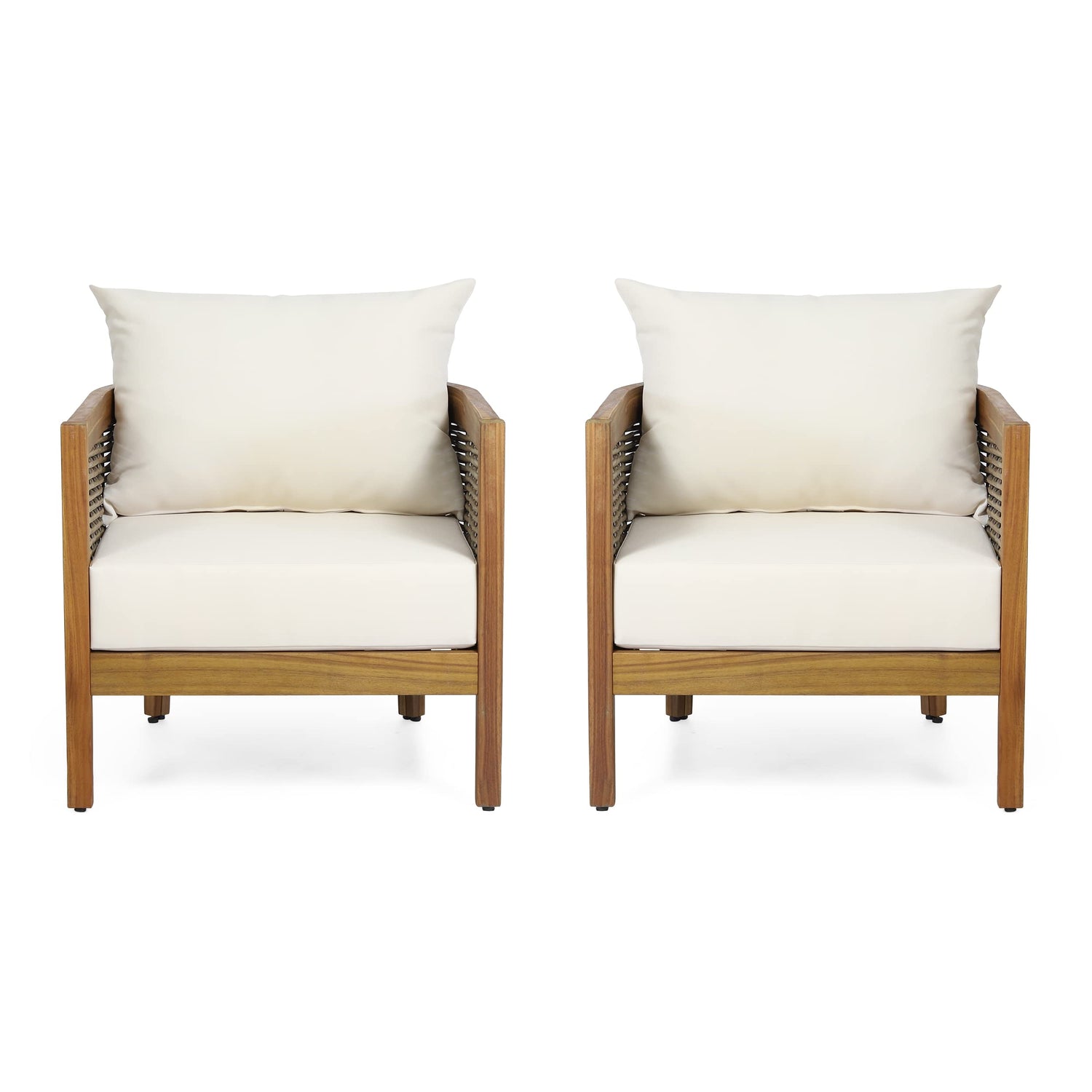 Details: Enjoy the warm sunshine in luxurious seating that is sure to bring an extra boost of style to your space. Combining a gorgeous blend of mixed materials, our club chair set will be a flawless addition to any outdoor lounge area. This can be used as a standalone or can be used to accent your existing furniture, making this a dream for those who love to personalize their space. With solid acacia wood frames, wicker accents, and plush outdoor cushions, these chairs offer hours of conversation for you and your guests. Includes: Two (2) Club Chairs Material: Acacia Wood Accent Material: Faux Rattan Cushion Material: Water Resistant Fabric Cushion Composition: 100% Polyester Finish: Teak Accent Finish: Mixed Brown Cushion Color: Beige Hand-Crafted Details Assembly Required Dimensions: 29.50 inches deep x 27.50 inches wide x 35.40 inches high Seat Dimensions: 28.25 inches deep x 24.50 inches wide x 10.50 inches high Arm Height: 24.75 inches .