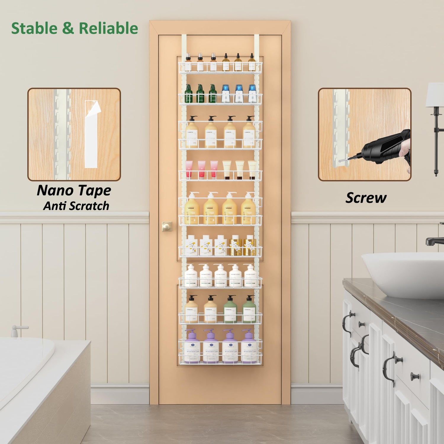 • Stable and Reliable: To further increase stability and prevent shaking, we provide double-sided nano tape and screws to connect the pantry organizer rack firmly to the door or wall.