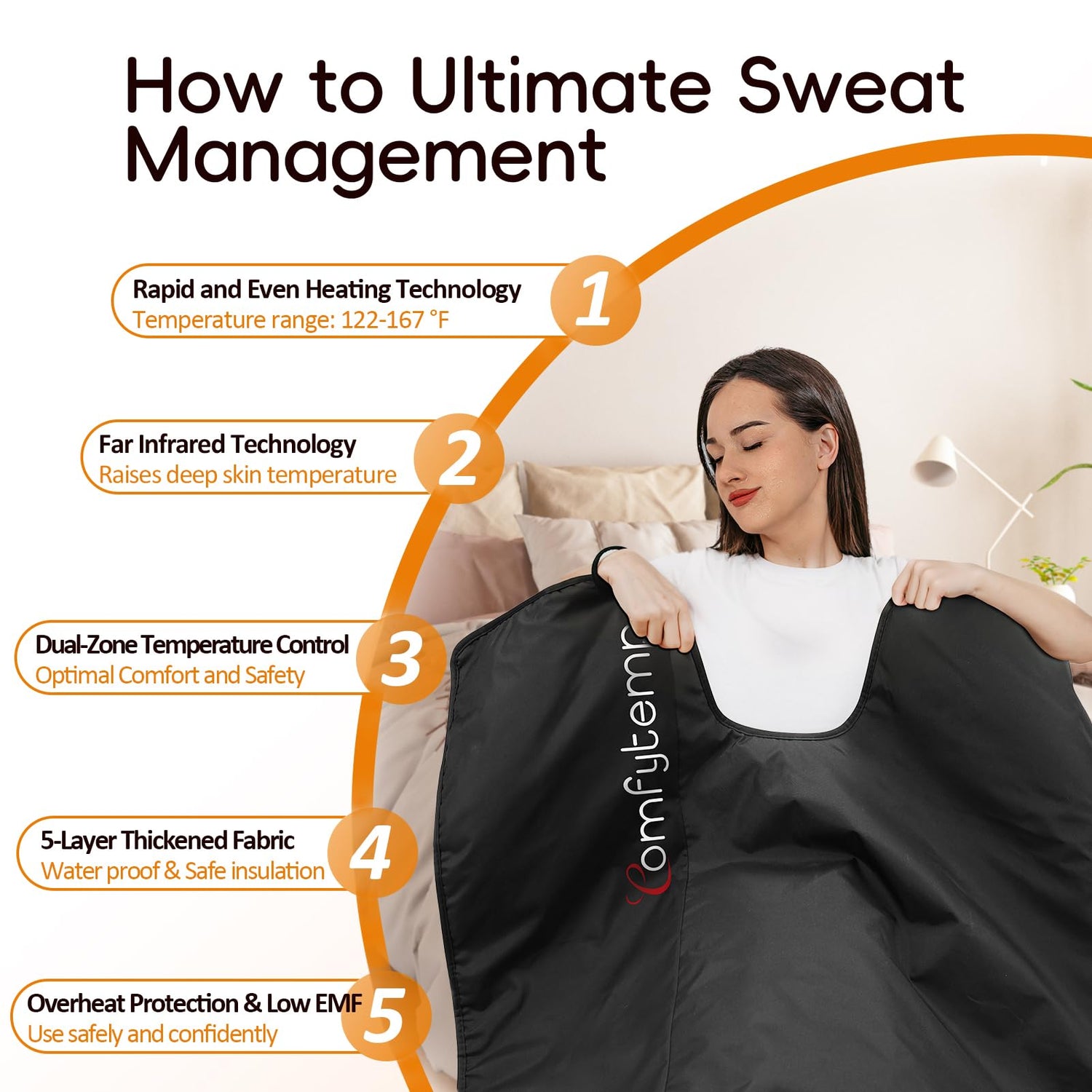 - Convenient and Economic Sauna Experience at Your Fingertips: Tired of rushing to a spa or gym for a sauna? They’re far and expensive. Why not try the Comfytemp Infrared Sauna Blanket S1? Measuring 35"x78", it’s large enough for most body types and perfect for family use. With it, you can enjoy a private and convenient sauna experience at home, reaping the benefits of sweating and relaxation. It’s more compact than a steam sauna box, allowing you to lie on your bed, sofa, carpet, or yoga room.