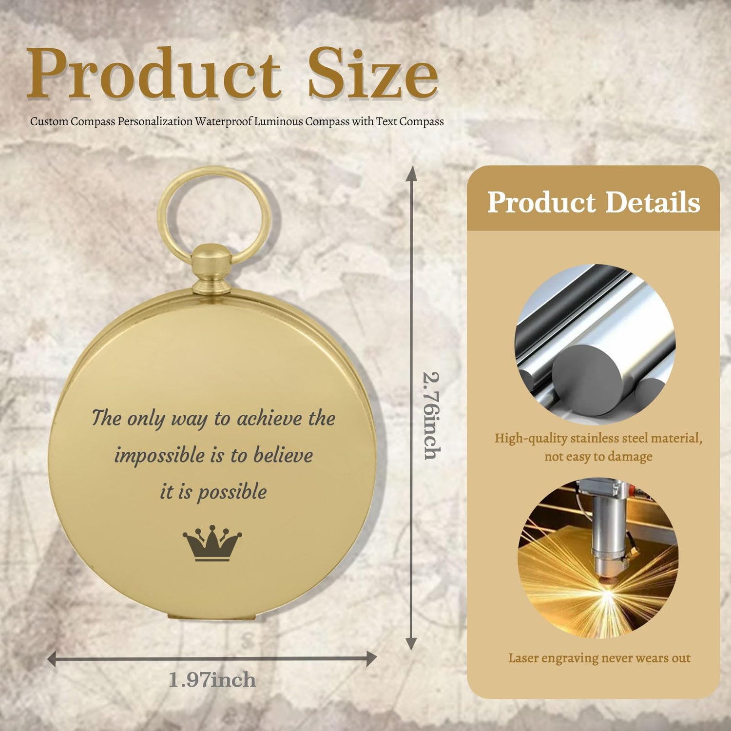 - Customized Compass material: The compass is made of metal copper and acrylic mirror, with a retro nostalgic design, equipped with a 360-degree rotating bezel, with the help of a magnetic needle composed of a liquid-filled capsule (no bubbles), it can swing quickly and point freely to the north, easy to navigate and locate, high sensitivity, good stability