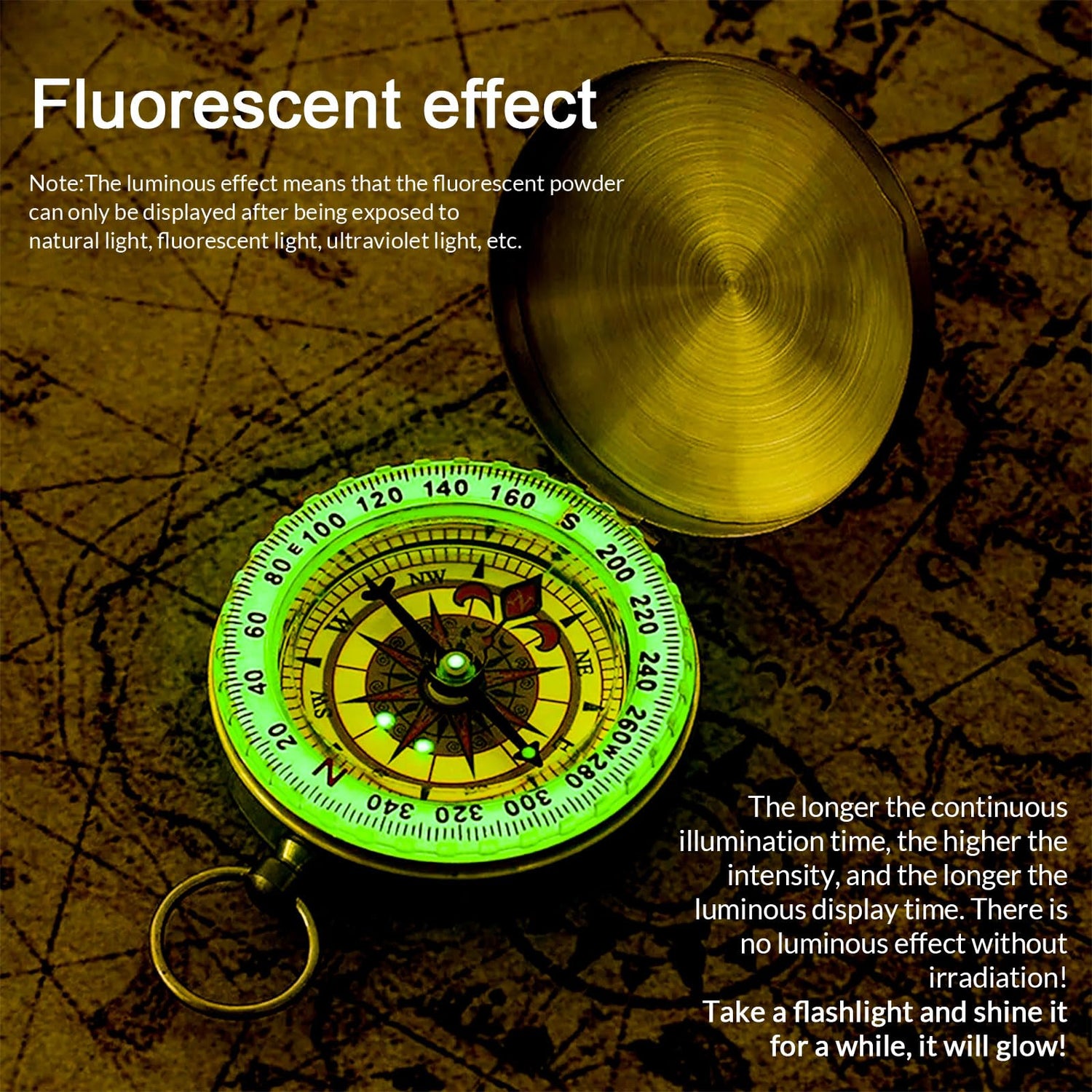 - Compass Fluorescent Design: This compass uses the same advanced luminous technology as the military compass. When the hiking survival compass is exposed to sunlight or any light, it can absorb energy and emit a bright light in the dark, illuminating the way forward. The longer the exposure time, the longer the luminous time. Ensure that you will not lose your way in any weather conditions, and escort your every outdoor journey in all directions