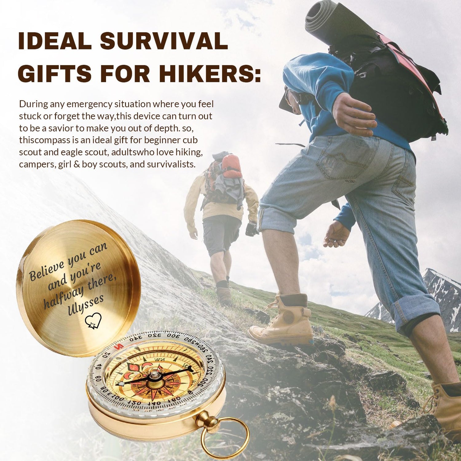 - Personalized Compass: Click "Customize Now" to upload the text you want to customize, whether it is your name, initials or your favorite design, we will help you realize it. It is an ideal land navigation device for hikers, campers, scouts and survivalists, meeting the needs of different outdoor enthusiasts
