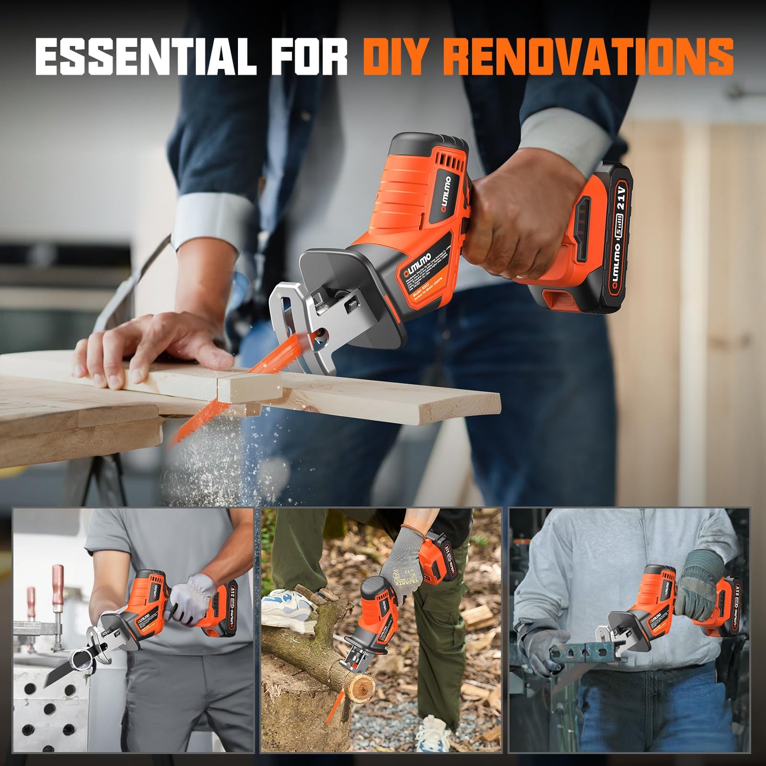 - 【Ergonomic Design & Safety Lock】Designed for comfort and safety, this mini battery reciprocating saw features a rubberized grip, low-vibration operation, and a safety lock to prevent accidental starts. Perfect for extended one-hand use