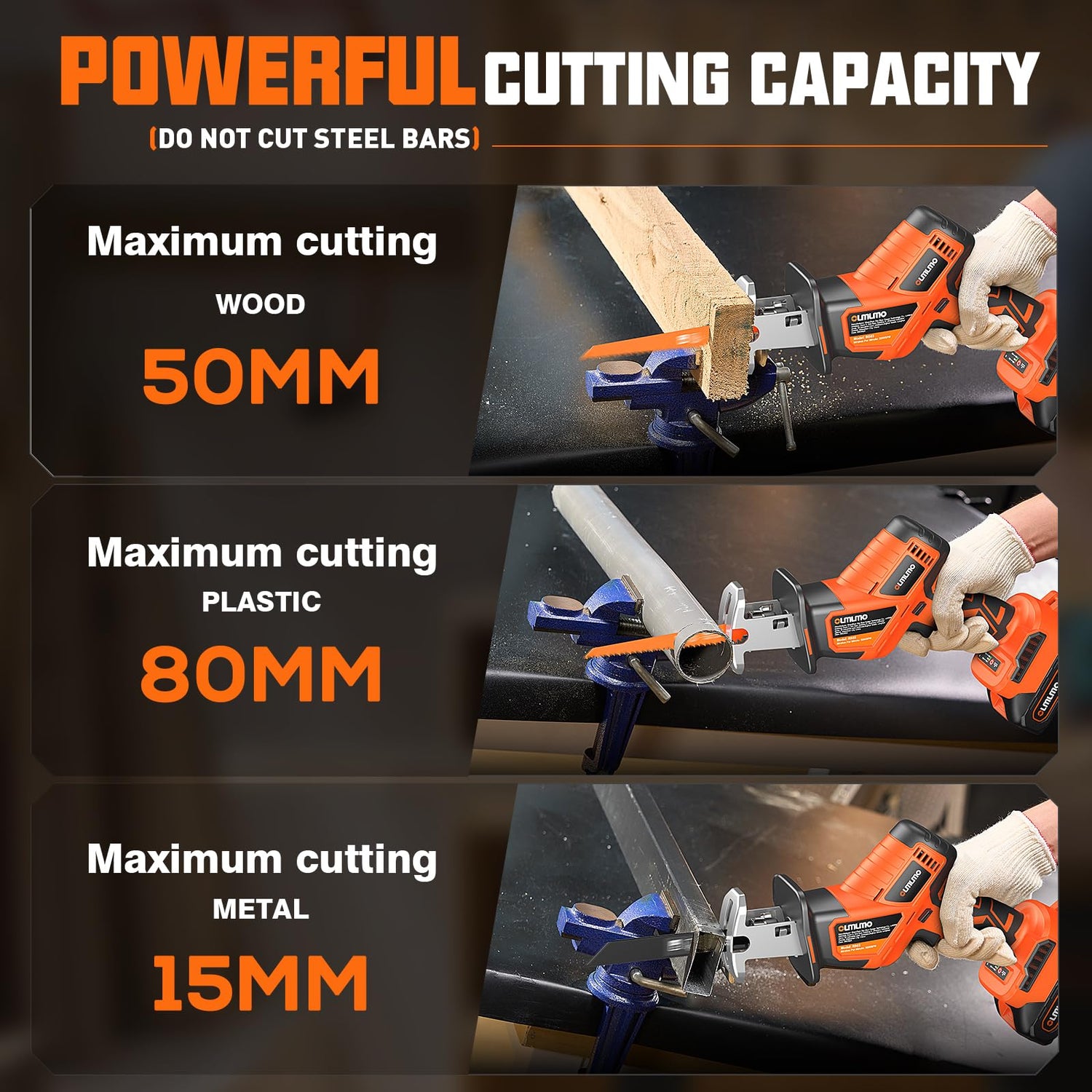- 【Multi-Material Cutting with 28mm Stroke】This reciprocating saw battery powered delivers a 28mm stroke for powerful, fast cutting through wood (50mm), metal (20mm), and plastic pipes (80mm). One saw handles all your household or workshop cutting tasks