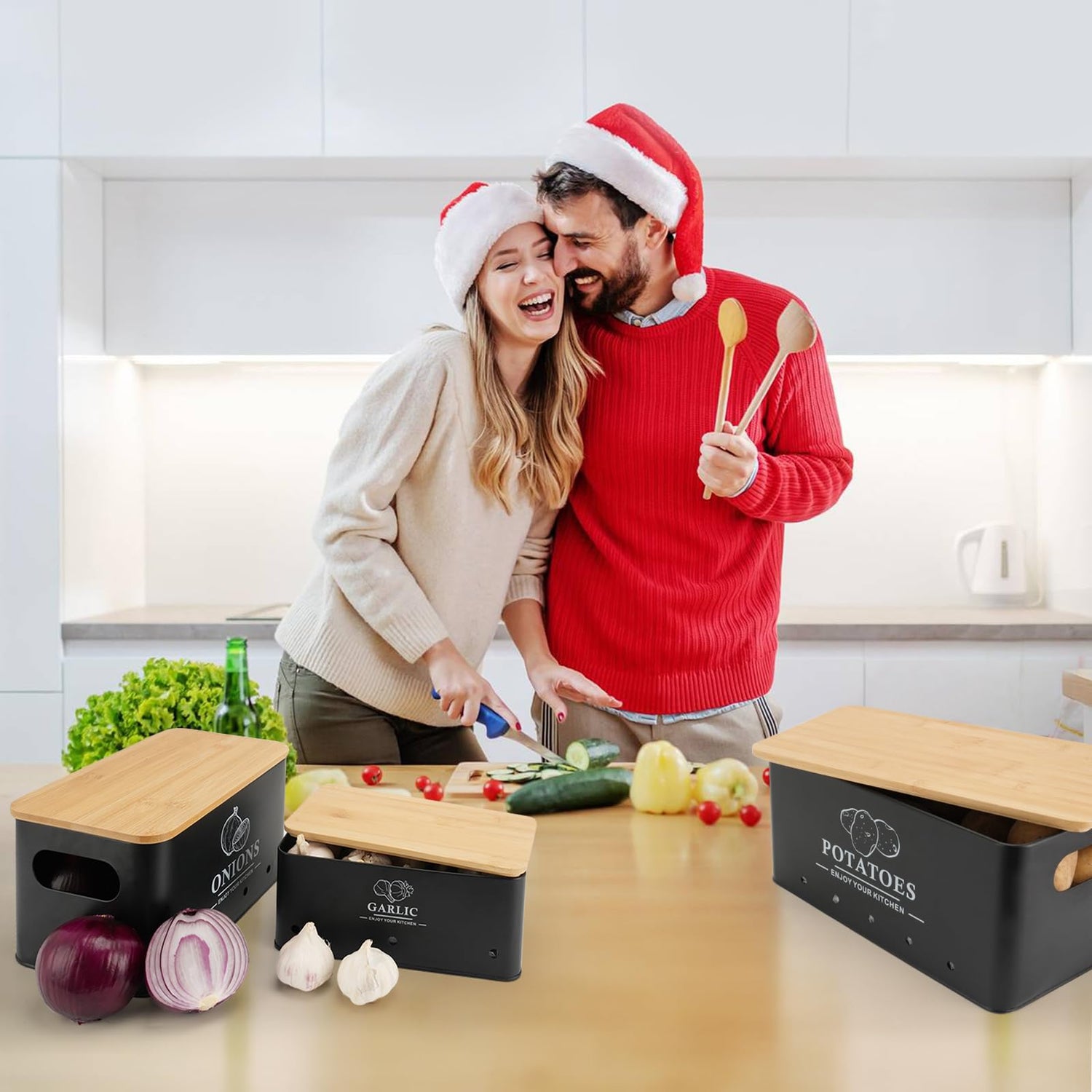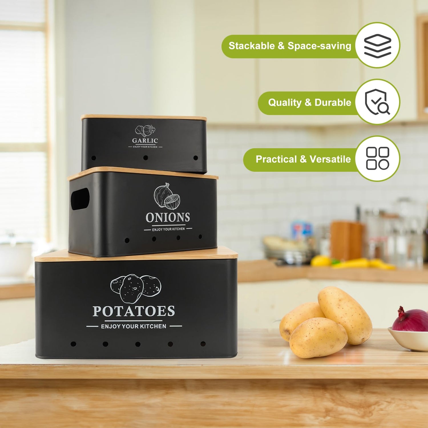 Dekosilave Kitchen Vegetable Storage Set of 3, Metal Onion Garlic Potato Storage Set, Kitchen Canisters Vegetable Keeper Containers with Aerating Holes and Wooden Lid (Black)