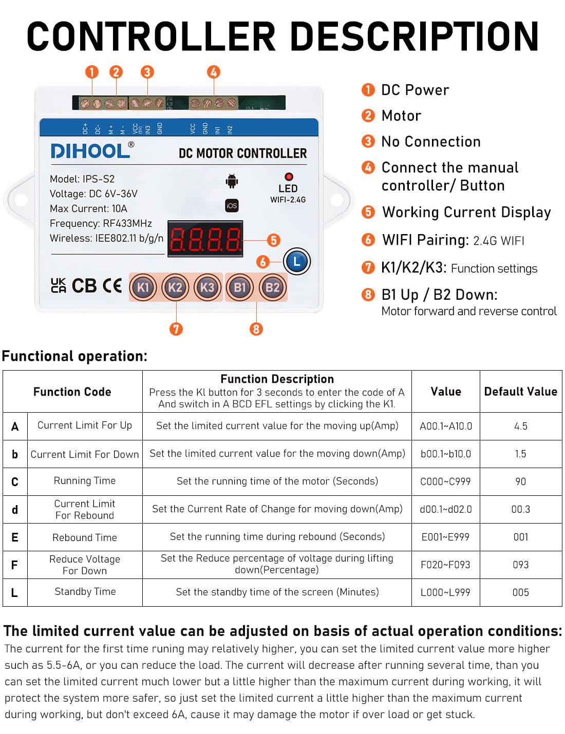 - Four options for operating: 1.The button on the IPS-S2 controller (B1-UP, B2-DOWN); 2.Wired Handle button length up to 2.5m(if you need the pedal button, you can buy from Bundles); 3.The eWelink APP (download from the APP or Android Store) ;4.The wireless remote