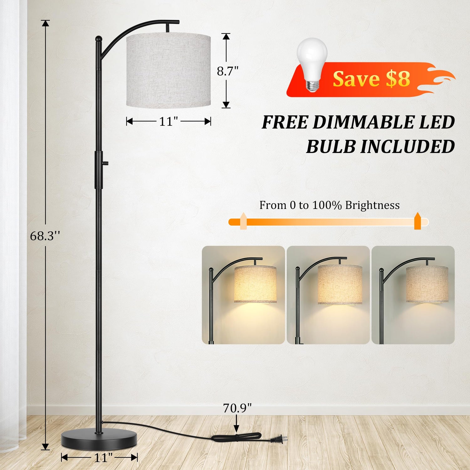 Dimmable Floor Lamp, Arc Floor Lamps for Living Room, Stepless Dimming Modern Standing Lamp with Linen Shade, Tall Lamp for Bedroom Office Dining Room- Black