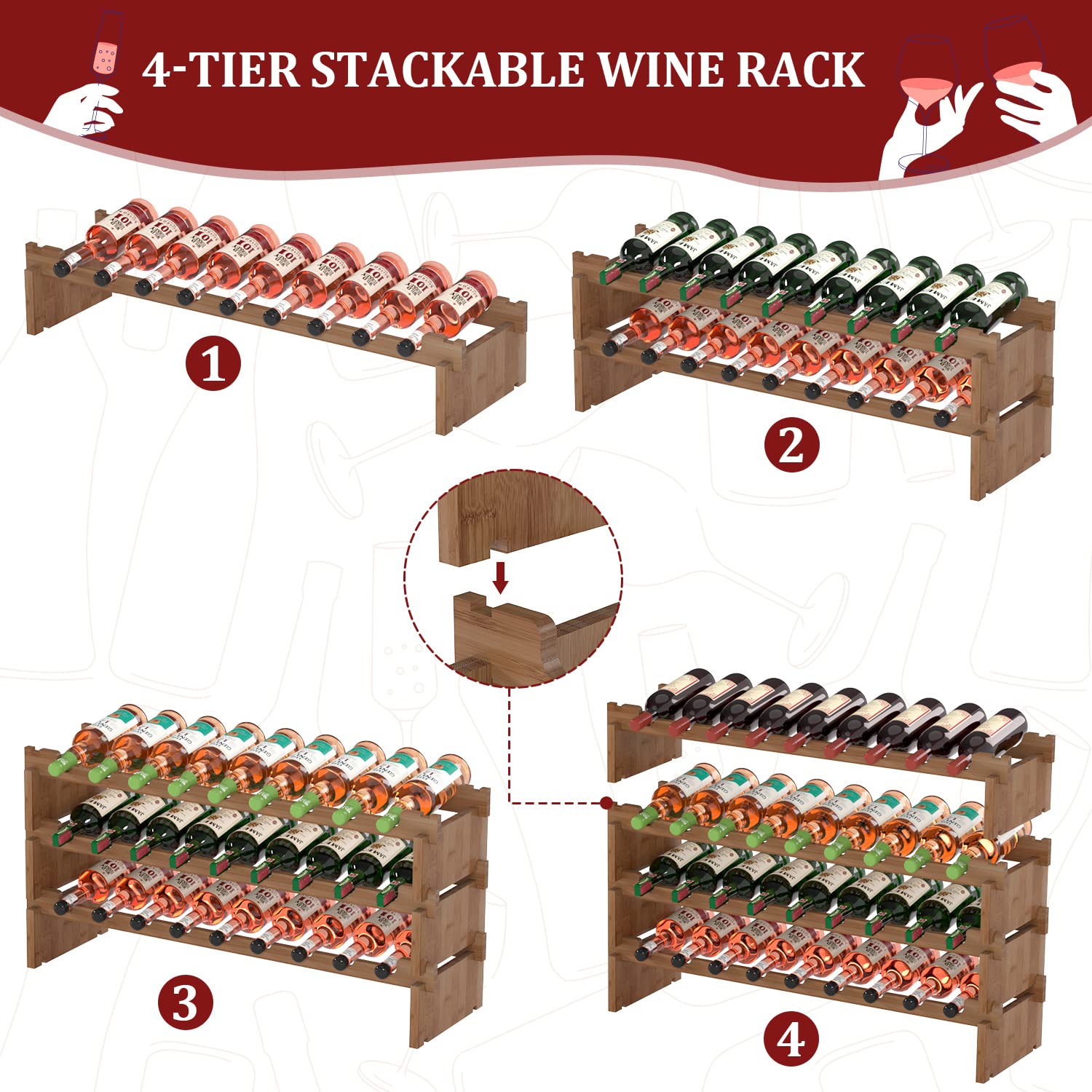 - MODULAR STACKABLE WINE RACK: Each partition has deep grooves and the partitions are tightly fastened to each other without loosening. The 4-tier compact design saves a lot of space and holds enough wine. You can also continue to stack up to the number of layers you like.