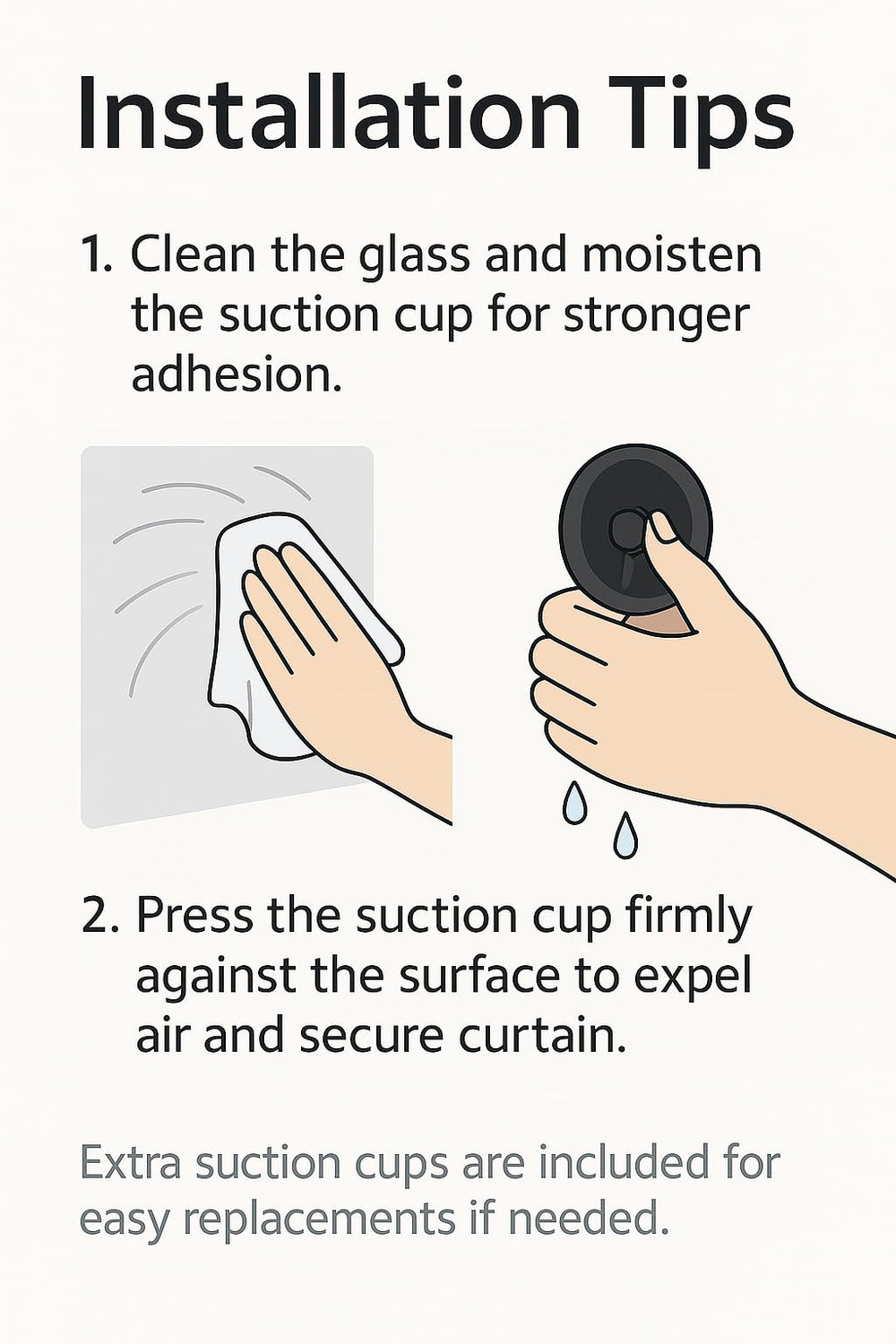 • ✅EASY INSTALLATION : CLEAN THE GLASS and MOIST the suction cup,then stick the curtain on windows or any smooth surface in minnutes with suction cups;❤Warm Tips:1, Clean the window glass dust,2, Moist the suction cups with little water,we supply the spare suction cups for replacement.